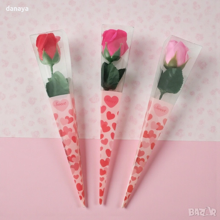 Опаковка: прозрачна конусовидна кутия с романтичен дизайн