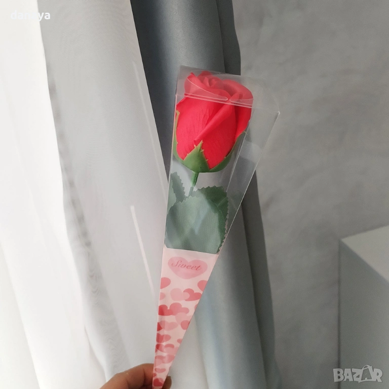 Тази изкуствена роза е стилно поднесена в прозрачна конусовидна кутия с романтичен дизайн и сърца, което я прави напълно готова за подаряване. Розата е изработена с внимание към детайла и запазва красивия си вид дълго време, без да увяхва и без нужда от поддръжка. Компактната форма и елегантното представяне я превръщат в идеален избор за малък, но запомнящ се жест.