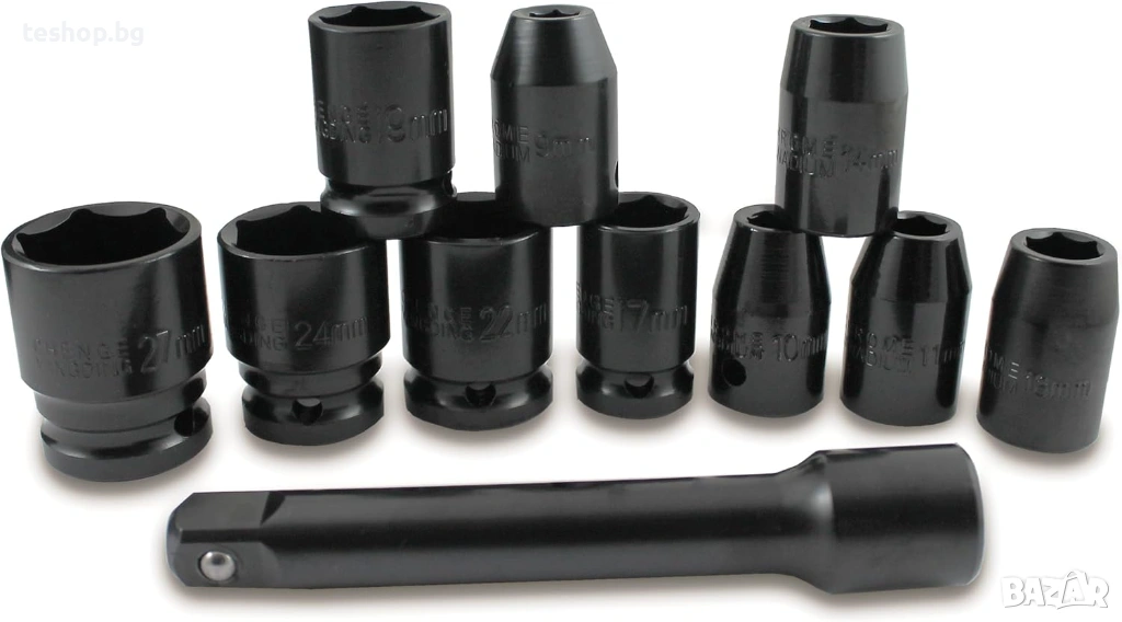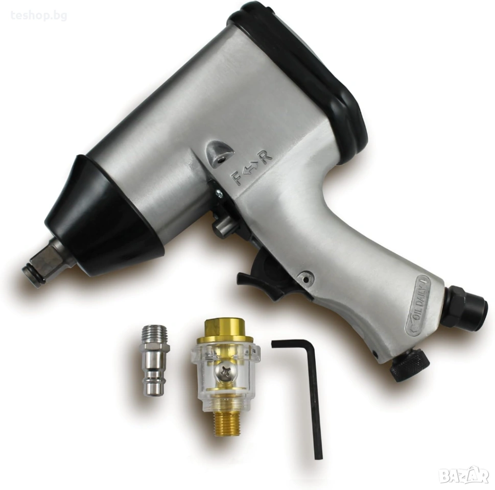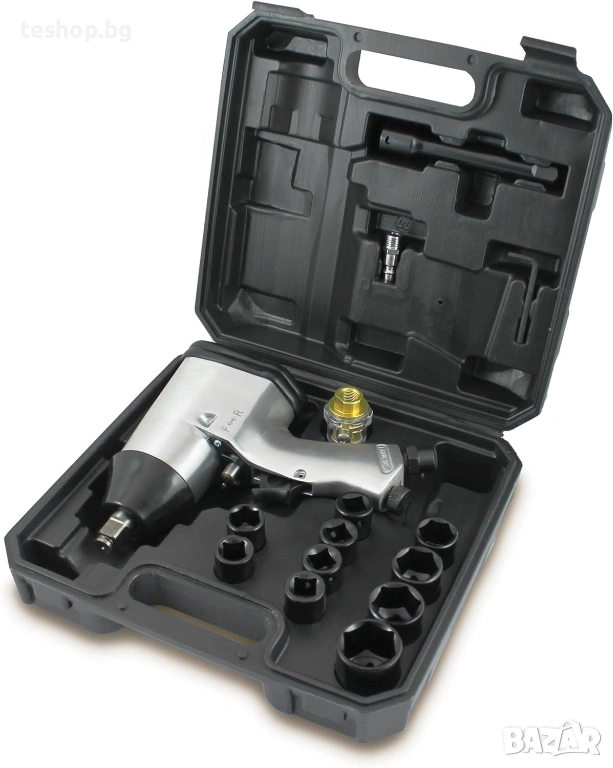 Bituxx комплект от 16 части. Комплект ударен гайковерт с компресиран въздух Състои се от ударен гайковерт (311Nm) с 10 ударни вложки и аксесоари. 1/4-инчова вложка с адаптер за бързо освобождаване (1/2 инч)