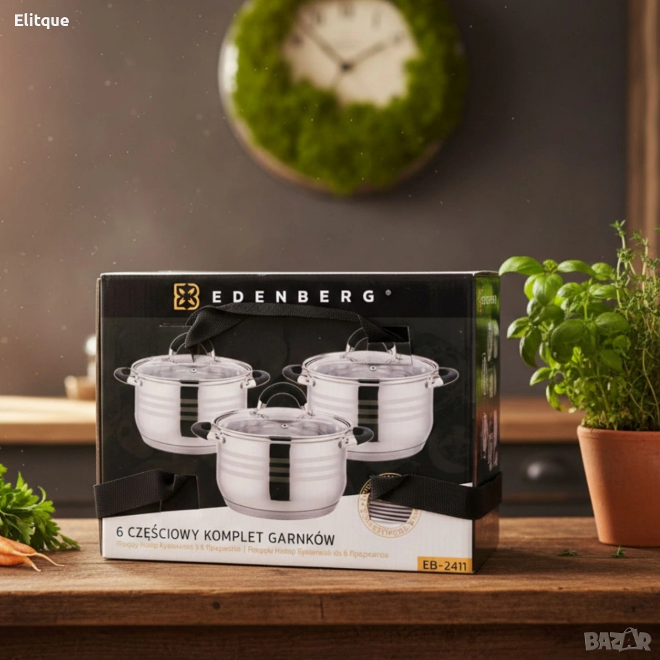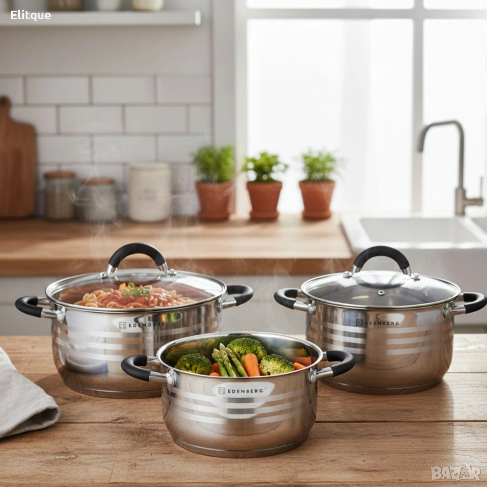 Съдържание | Какво ще намерите в опаковката на Премиум комплект съдове Edenberg 6 части? В опаковката на комплекта ще намерите всичко необходимо за функционална и красива кухненска посуда: Тенджера 16 x 10.5 см – вместимост 2.1 литра Тенджера 18 x 11.5 см – вместимост 3.0 литра Тенджера 20 x 12.5 см – вместимост 4.0 литра Три капака от термоустойчиво стъкло