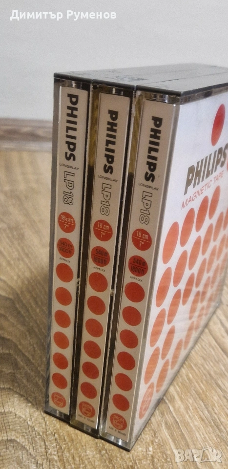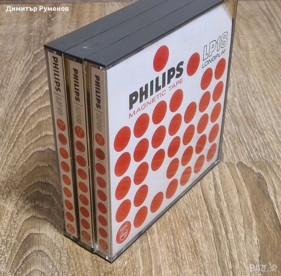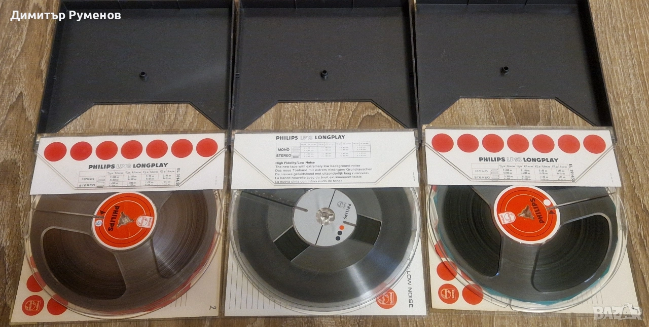 Три отлични филипса 18см, с перфектни ленти, проверени и тествани.Записи скорост 9.5см/сек, 4ри писти, стерео и една моно.Много музика за прослушване, стил 60те, поп, рокендрол, диско, отлични записи.