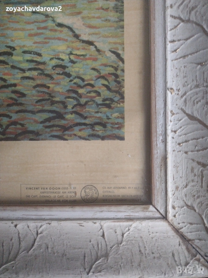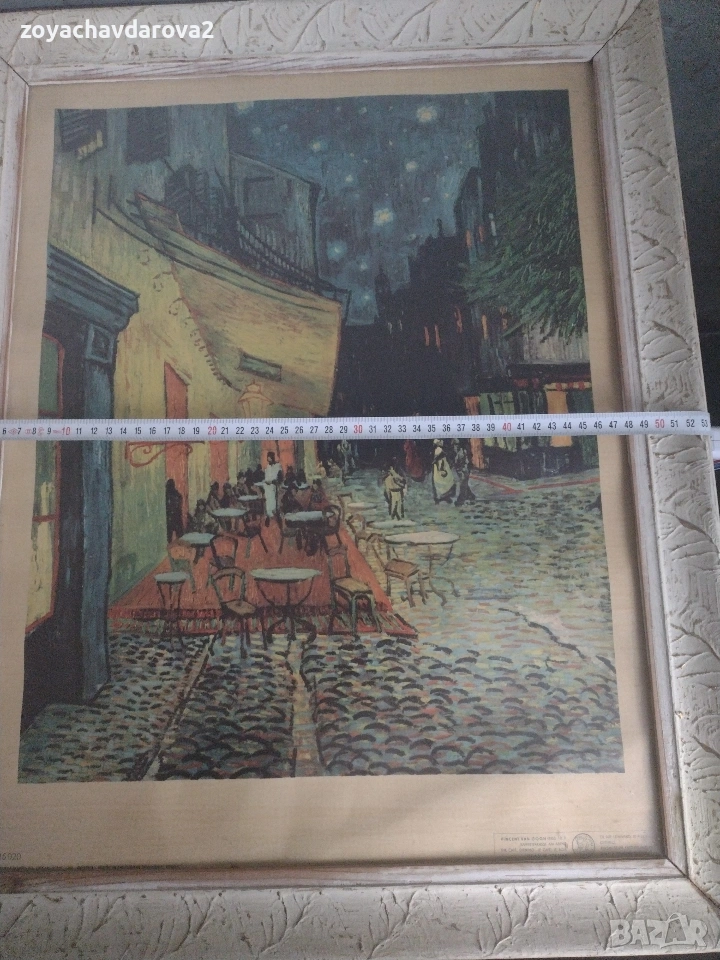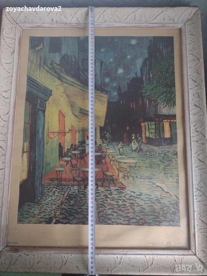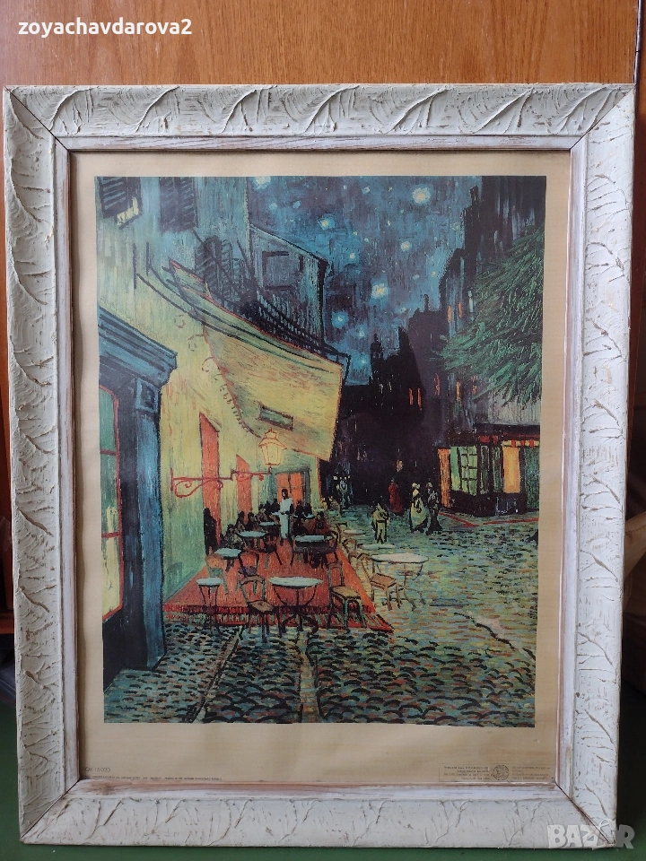 СТАРА КАРТИНА РЕПРОДУКЦИЯ НА "КАФЕ ТЕРАСА ПРЕЗ НОЩТА (1888) - ВИНСЕНТ ВАН ГОГ. КАРТИНАТА Е С ДЪРВЕНА РАМКА, ПРЕДНО СТЪКЛО, КУКА ЗА ЗАКАЧВАНЕ НА СТЕНА. РАЗМЕР С РАМКАТА 53,5/66,5 СМ.
