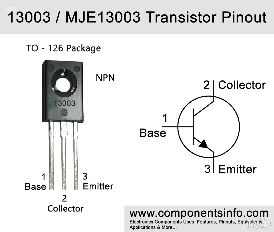 1. MJE13003 - STM, 400V, 1.5A, 40W, TO126, 3000бр. - 0.36 евро на брой
