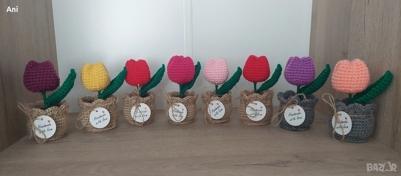 Ръчно плетени декоративни лалета в саксийка. Изработени с внимание към всеки детайл. Подходящи за подарък, интериорна декорация или празничен акцент.