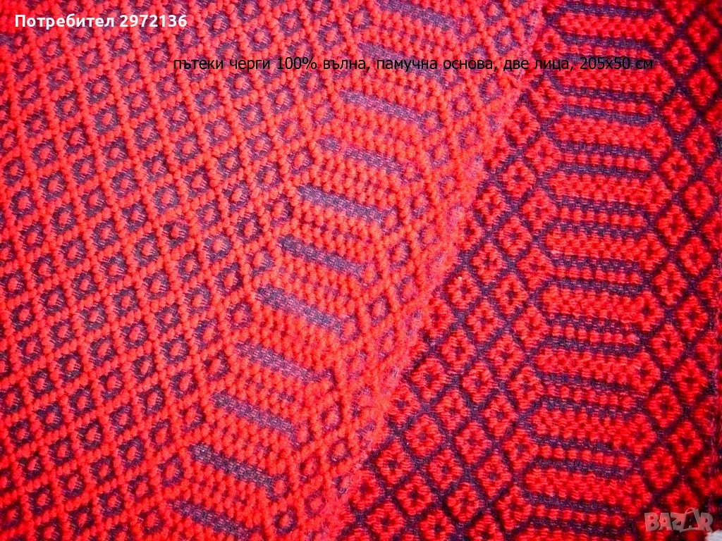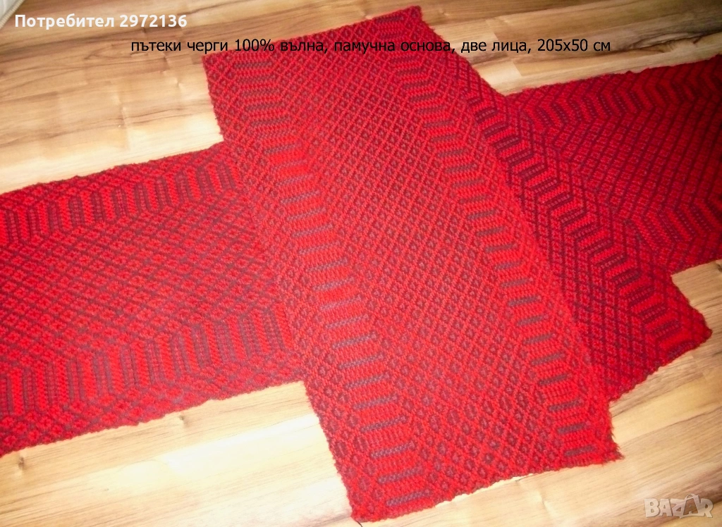 - черги (ковьори) червени, 100% вълна, вълнена черна основа, с две лица, 205х50 см, тегло 0.600 кг/брой, цена 103 €/брой; налични два броя; снимки 4 и 5;