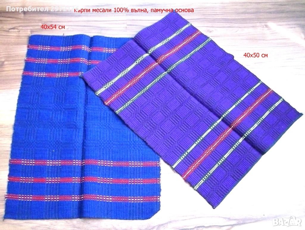 - месали вълна 100%, памучна основа, 40х54 см син, 40х50 см лилав, тегло 0.130 кг/брой, цена 29 €/брой; снимки 8 и 9;