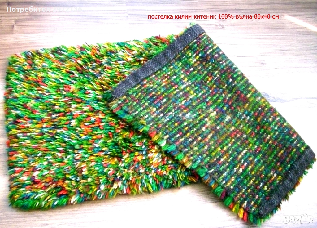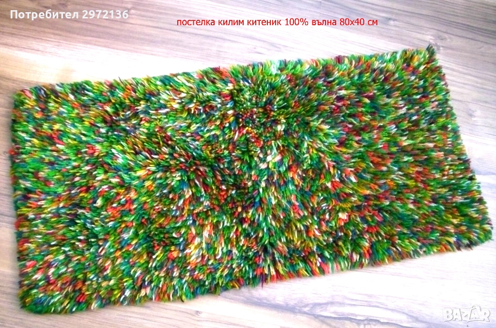 - китеник за под пъстроцветен, килим, постелка, 100% пресукана вълна, вълнена основа, височина на косъма 3 см, 80х40 см, тегло 0.650 кг, цена 86 €; снимки 6 и 7;