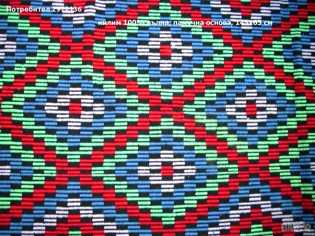 - килим за стена (ковьор) на ромбове, 100% вълна ръчно бродирана на памучна основа, 145х63 см, тегло 0.600 кг, цена 158 €; снимки 2 и 3;