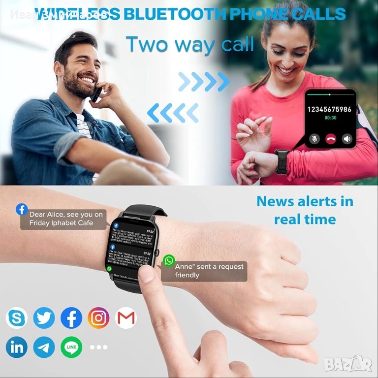 Bluetooth Calls & Smart Reminders: The smart watch has a built-in speaker and Bluetooth connection, allowing users to make and answer calls directly from their wrist, providing convenient calling services during exercise. The bluetooth watch can also receive different kinds of notifications like Facebook, Whatsapp, Twitter etc. Make sure you don't miss any important message without taking out your phone.
