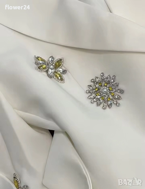 Елегантно бяло сако с камъни, размерът му е S, но може да стане на дами, носещи от S до М, ръкава е срязан от лакътя от едната страна има закопчаване и допълнително коланче от плат, с подплънки на раменете. Дължина: 65см, бюст:90-92 см, дължина ръкав : 57 см, талия:74 см, от рамо до рамо:40 см.