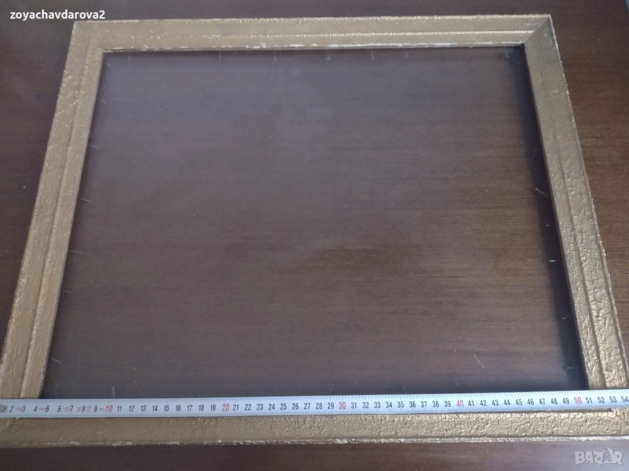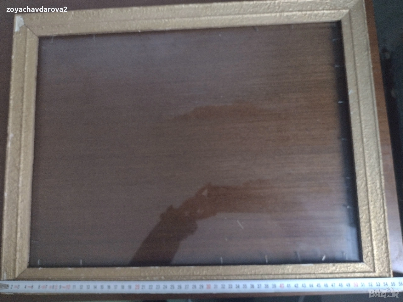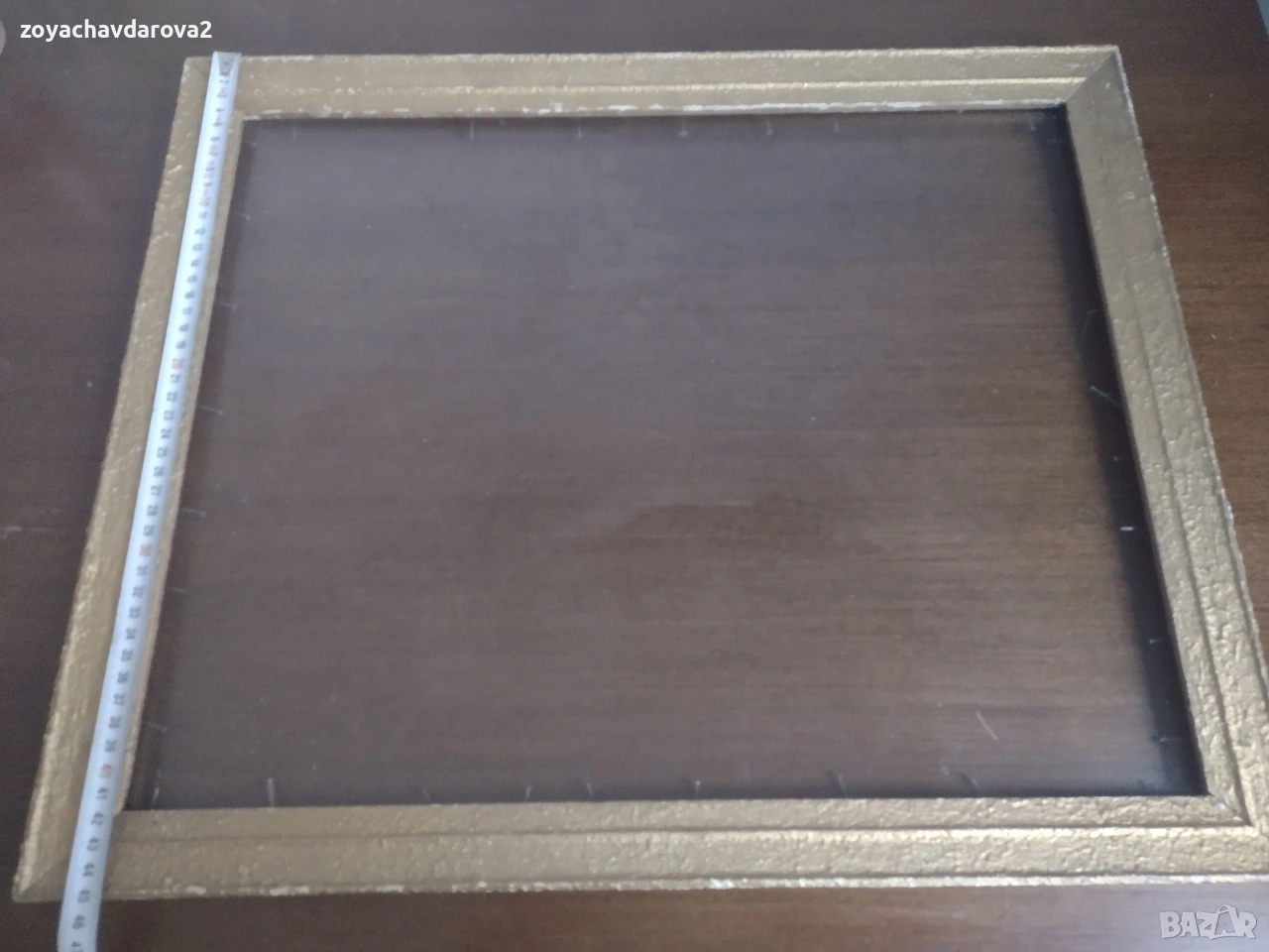 СНИМКА 1 - 2 : ПРАВОЪГЪЛНА, ЖЪЛТ БРОНЗ ВЪРХУ ДЪРВОТО, ДВЕ ГОРНИ МЕТАЛНИ КУКИ ЗА ОКАЧВАНЕ НА СТЕНА. РАЗМЕРИ С РАМКАТА: ДЪЛЖИНА 55 СМ., ВИСОЧИНА 45,3 СМ. РАЗМЕРИ СТЪКЛО : ДЪЛЖИНА 49 СМ., ВИСОЧИНА 39 СМ.
