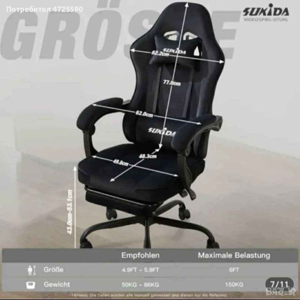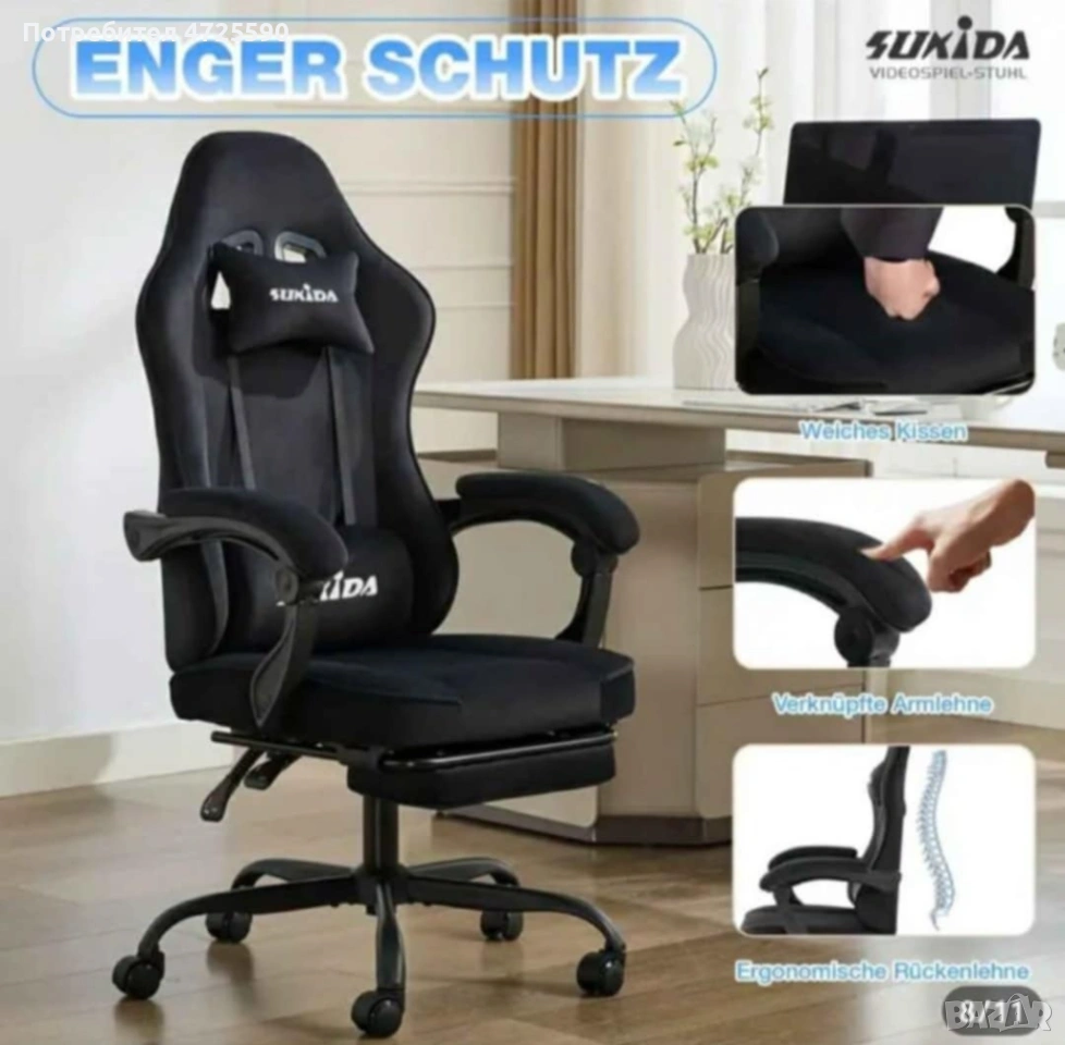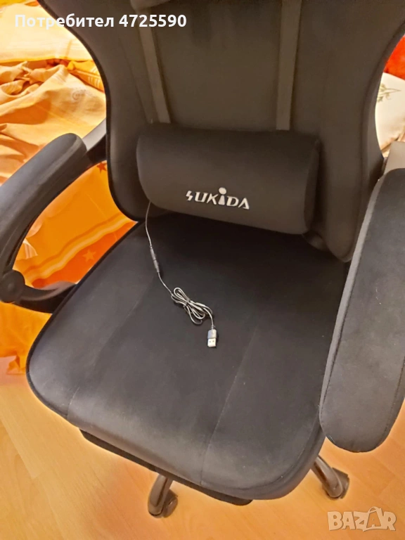 геймърски стол с черна велурена тапицерия. Ергономичен модерен дизайн, въртящ се на 360 градуса.