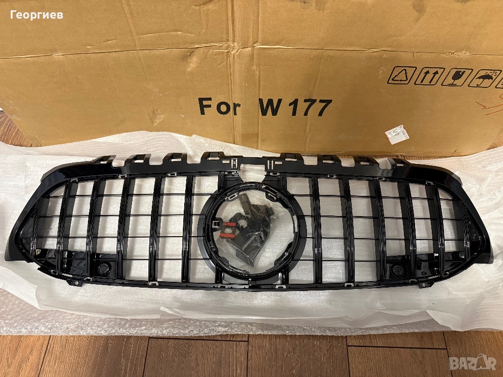 Спортна предна решетка тип „GT“ подходяща за: Mercedes-Benz W177 A-Class (Новата след 2018г.) *В комплекта не е включена предната емблема (ползвате си емблемата от старата решетка) *Този модел има предвидена дупка за предна камера, ако вашия автомобил не разполага с предна камера дупката ще остане празна (конкретно при този модел почти не се забелязва) Предназначени специално за модела! Високо качество на изработка! Перфектно пасванe.