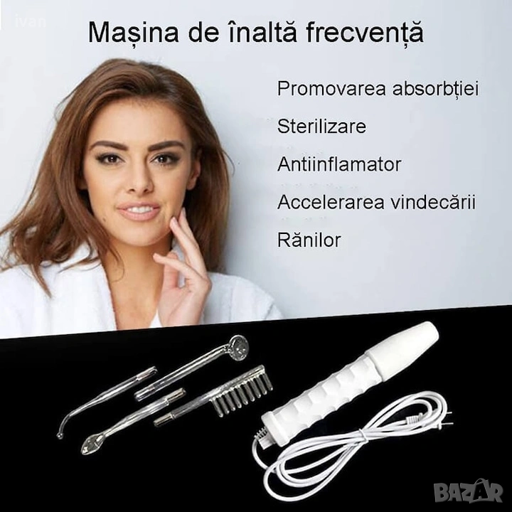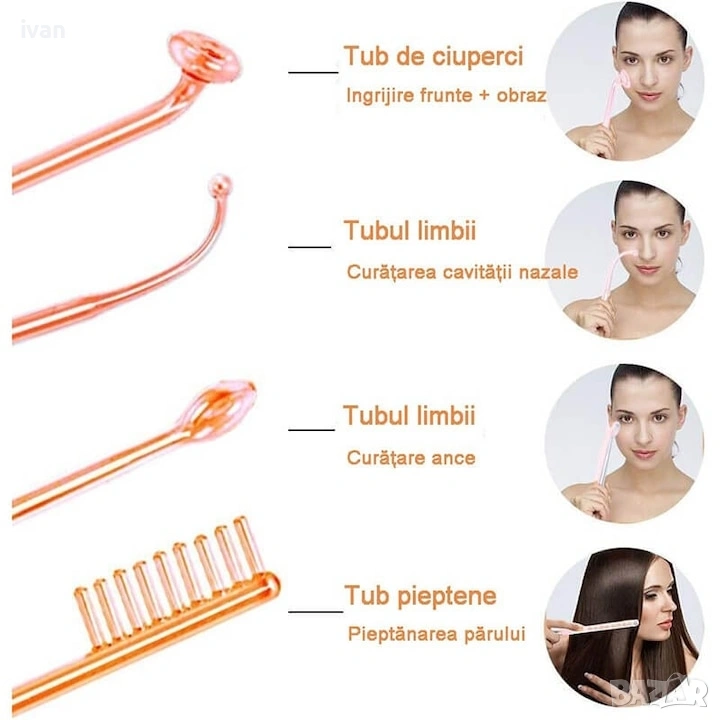 Покрийте очите с навлажнени тампони. Докоснете лицето с електрода и задръжте, но не повече от 10 секунди. При допир с кожата се образуват искри от електрода. След като приключите, изключете интензитета на „0”, уверете се, че апаратът е изключен и извадете електрода.
