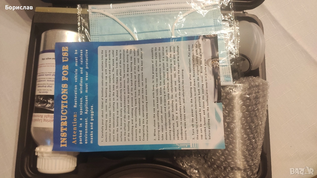 Продавам чисто нов комплект за химическо полиране на автомобилни фарове комплекта включва чаша с два накрайника отгоре две зарядни на 12 волта и за 220 волта 500 мл.препарат за почистване шкуркии всичко това мога необходимо за полиране. на фаровете и всичко. в компактно куфарче..