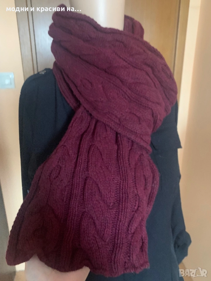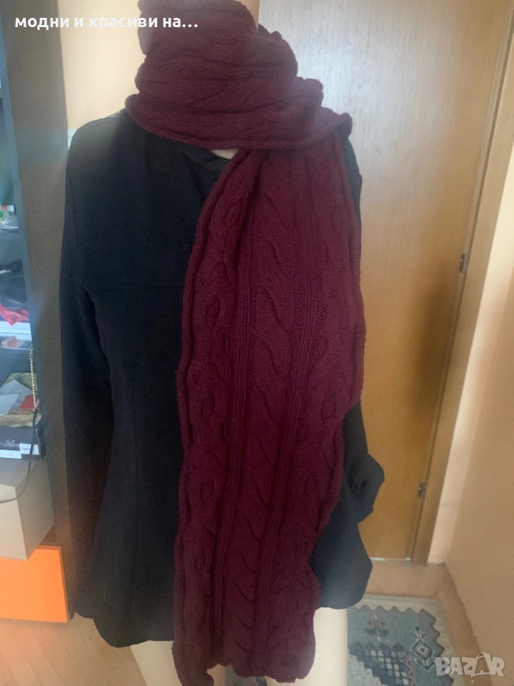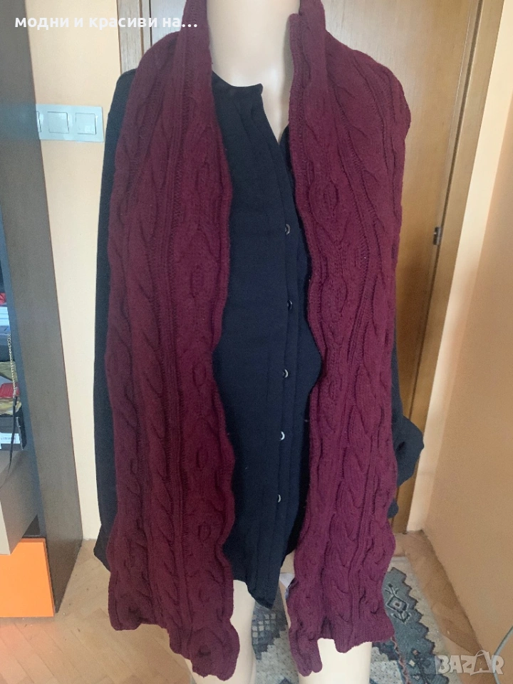 Шал плетиво в наситен цвят бордо с красиви едри плетеници. Дълбок, въздействащ цвят. Много топъл благодарение на високото съдържание на вълна в него-80%. Плътен и отличен изолатор на студа, подходящ за студените месеци. Скандинавско качество.
