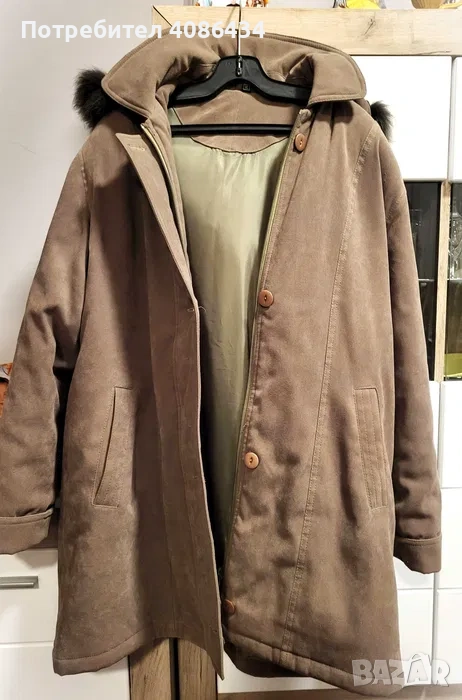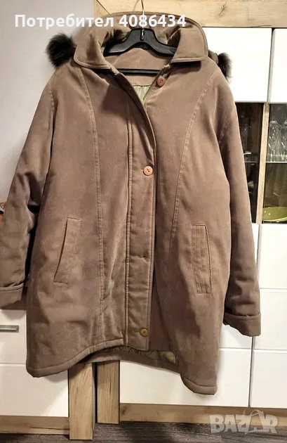 Продавам ново зимно дамско палто (тип канадка) размер ХL, но е по-скоро L, цвят каки (на снимките цвета изглежда по-кафяво, заради светлината). Палтото е много топло, качулката е подвижна, с цип. Закопчава се с цип отпред, старнични джобове. Дължина от рамото - 84 см, Гръдна обиколка - 63 см, ширина в раменете - 53 см, Не е носено, няма забележки.