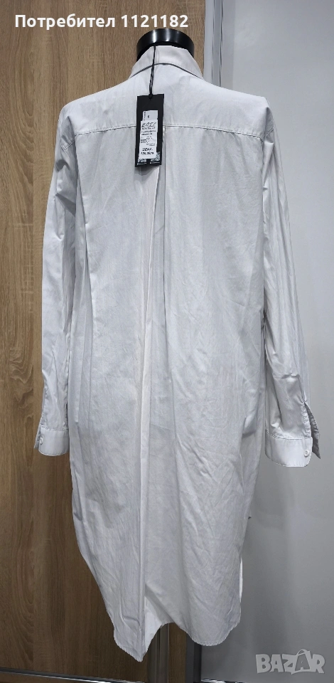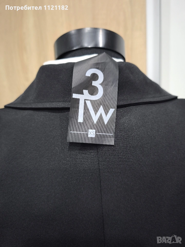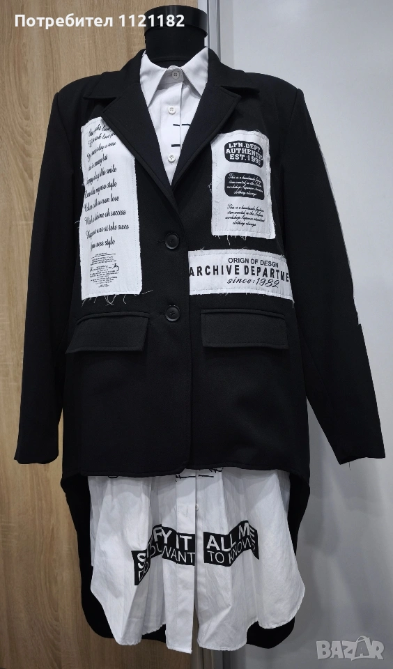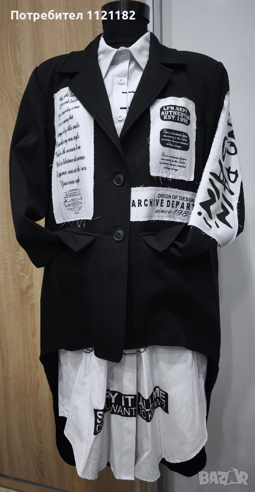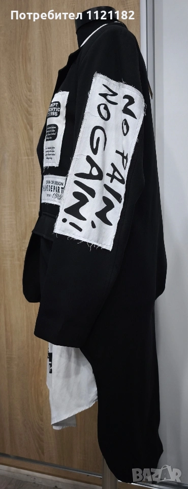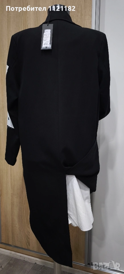 Черен дамски комплект чисто нов с етикет.Дълга бяла туника с фрак.Фрака има подплънки на раменете два джоба отпред и цепка отзад.По етикет е XS но на този бранд дрехите са доста уголемени затова по-горе съм писала че е L размер.Става за гръдна до 115 см.