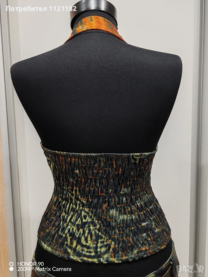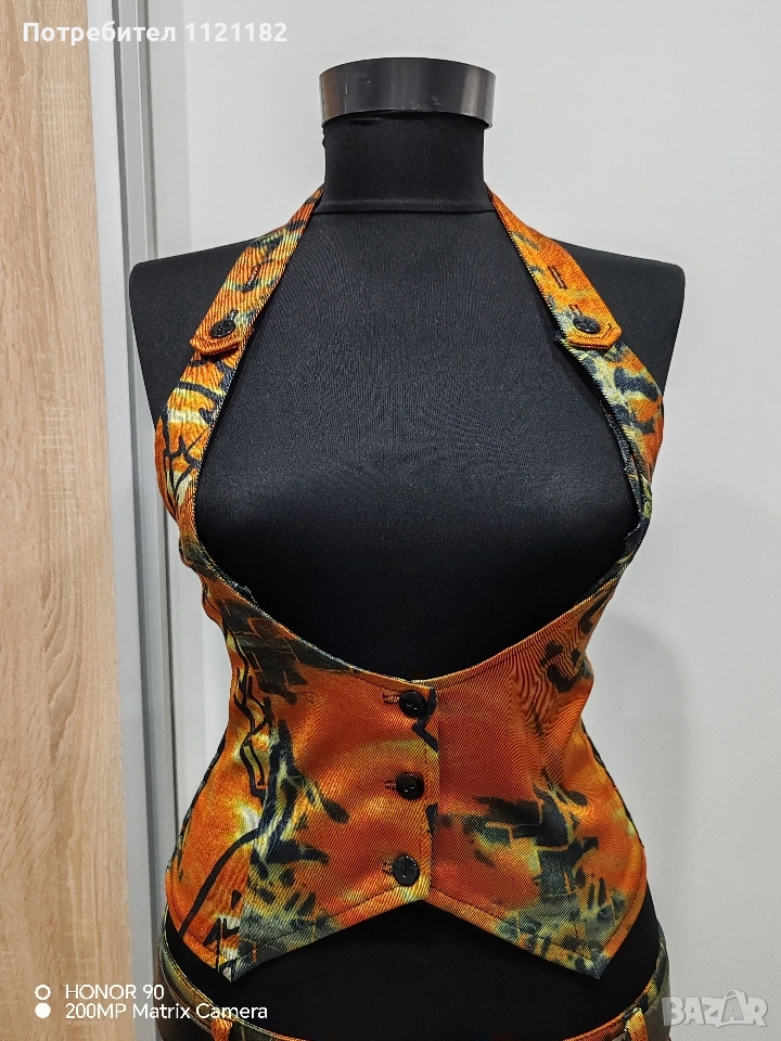 Уникален дамски комплект панталон и елек. Предната част в оранжев цвят, а задната тъмнозелено. Елекът отпред се закопчава с копчета а отзад е на ластик. Панталонът е с много ниска талия с два предни джоба и два отзад.Размер S. Без забележки.