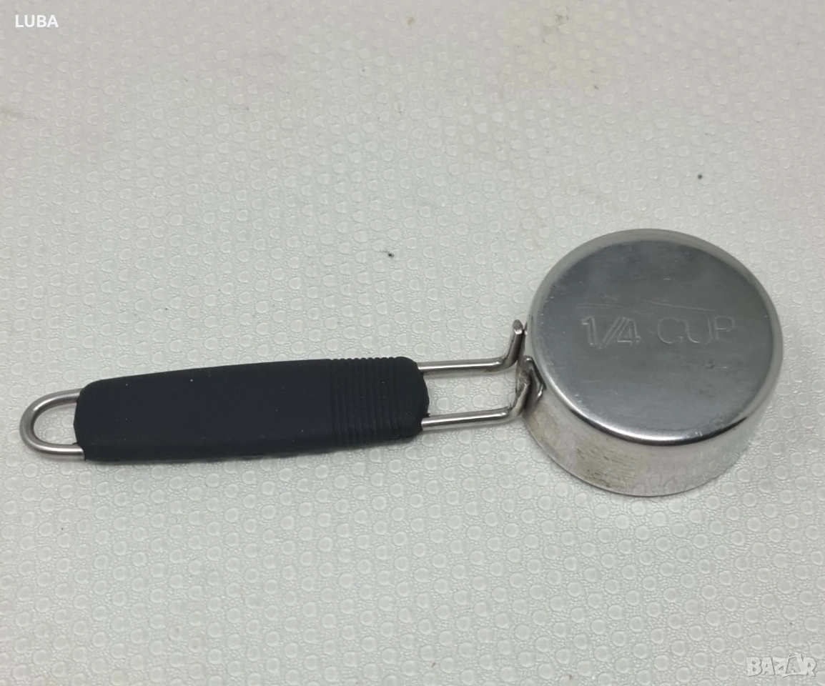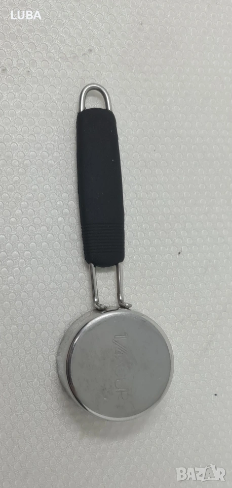 Това е мерителна лъжица или чаша. Изработена е от неръждаема стомана с черна, вероятно силиконова или пластмасова, дръжка. Капацитетът ѝ е 1/4 чаша (1/4 CUP), както е гравирано на дъното. Предназначена е за прецизно измерване на съставки при готвене или печене. Има малък отвор в края на дръжката за окачване или съхранение. Дизайнът е функционален и издръжлив.