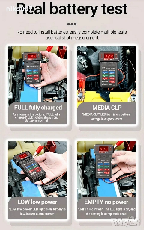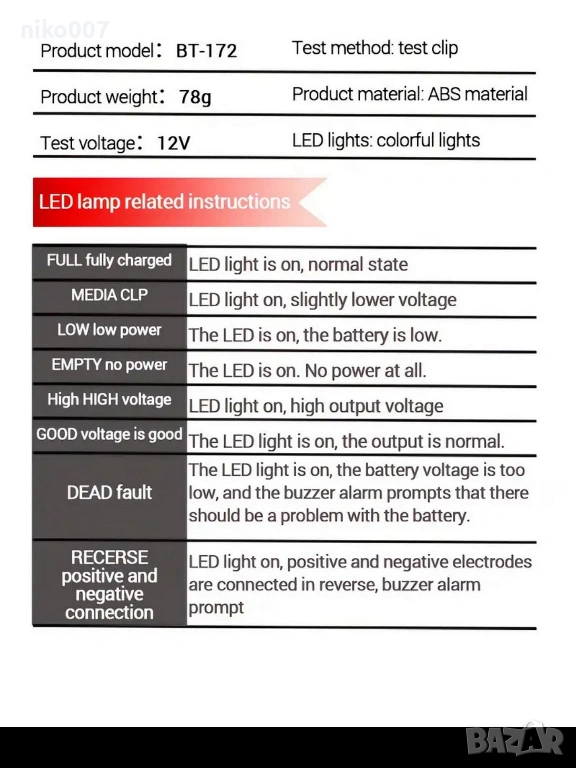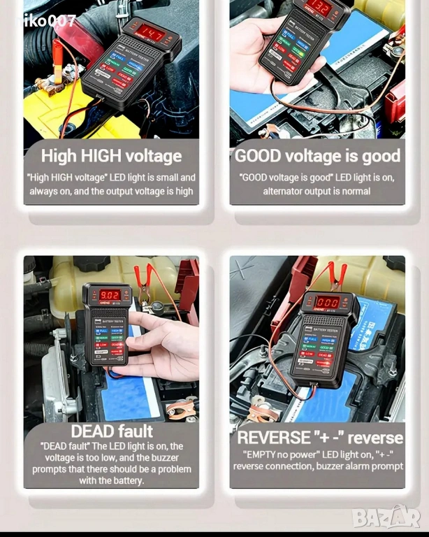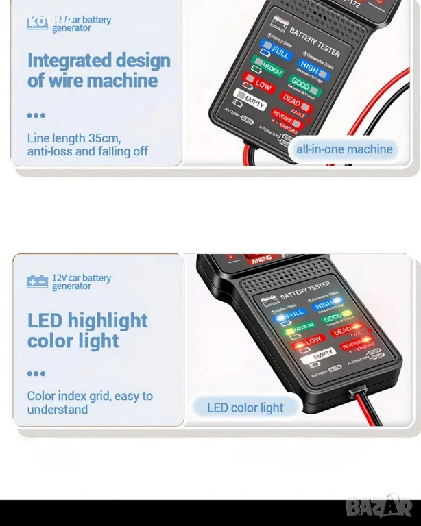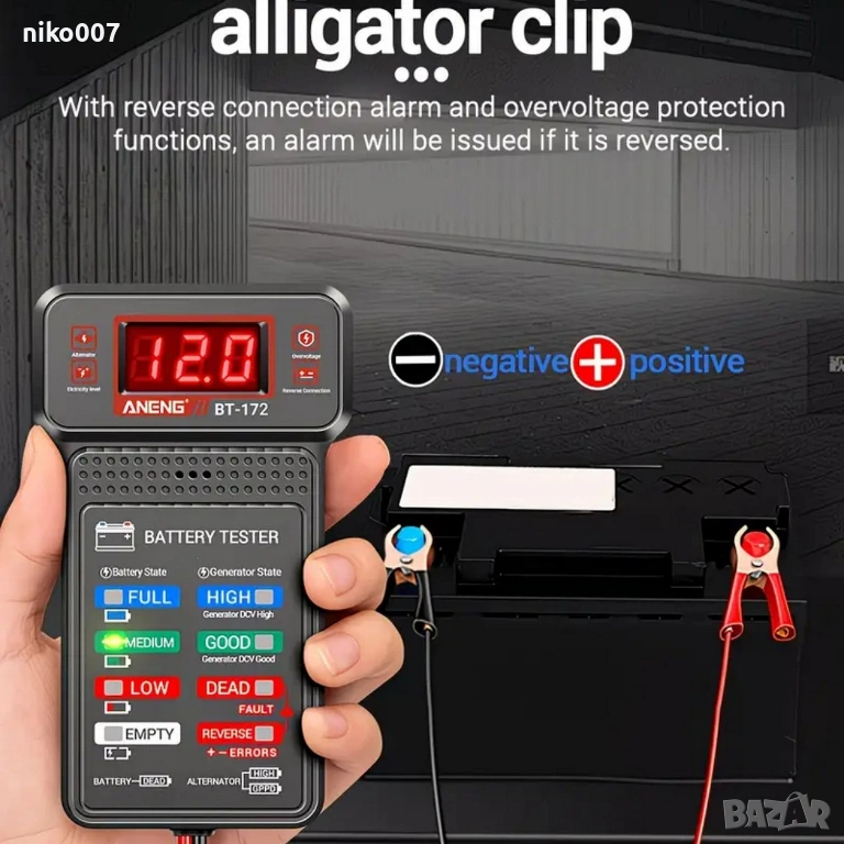 1. Проектиран за тестване на напрежение на 12V батерия или зареждане на генератора