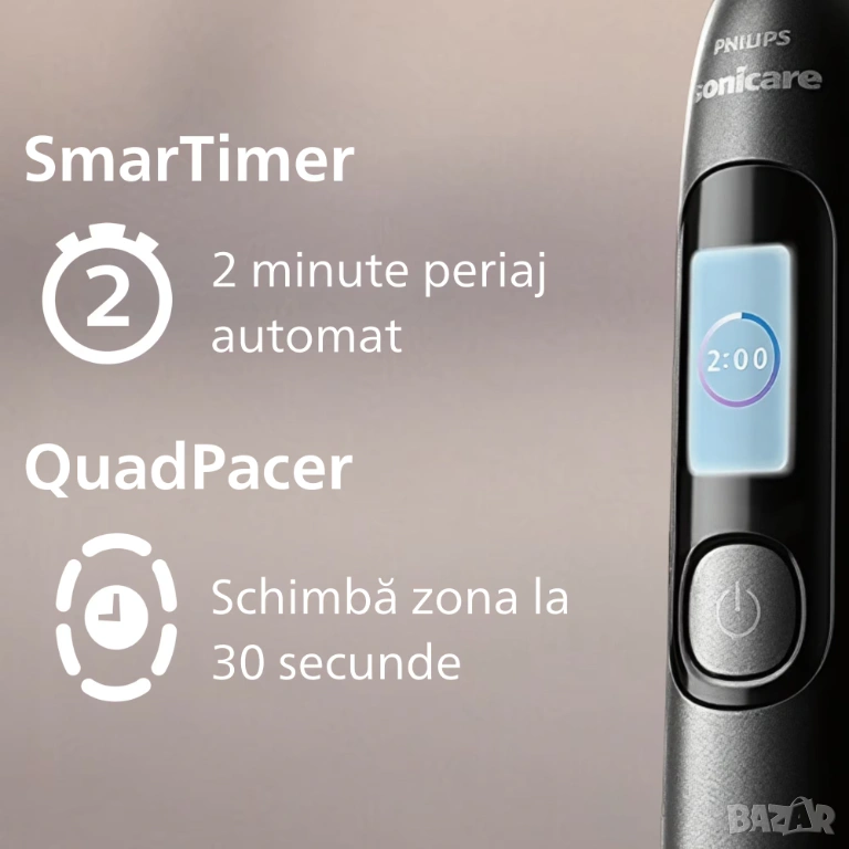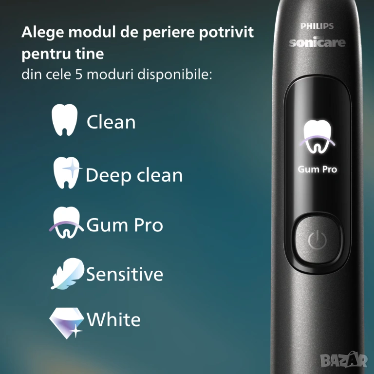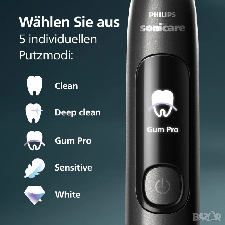 Предназначение: Възрастни, Тип четка за зъби: Звукова четка за зъби, Режими на миене: Ежедневна грижа, Дълбоко почистване, Грижа за венците, Чувствителна, Избелване.
