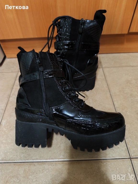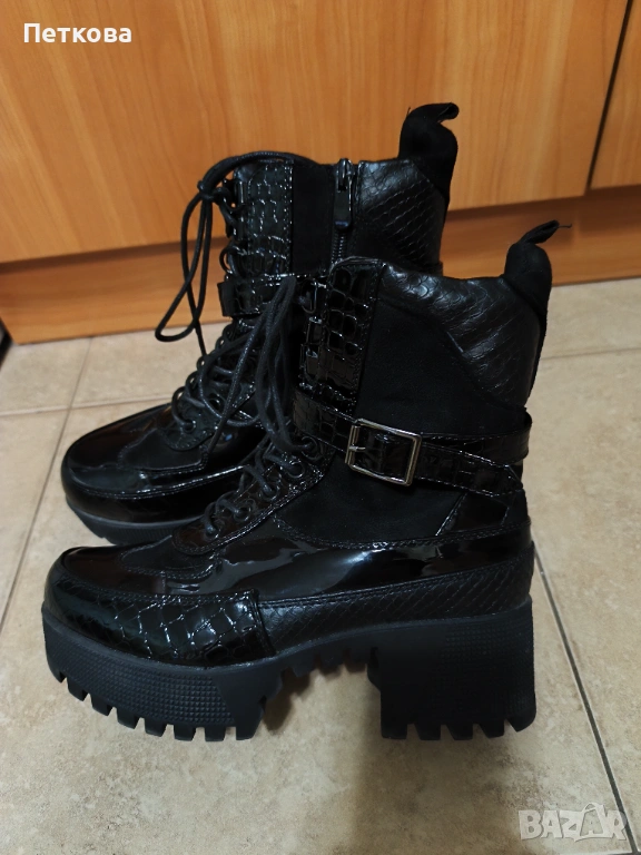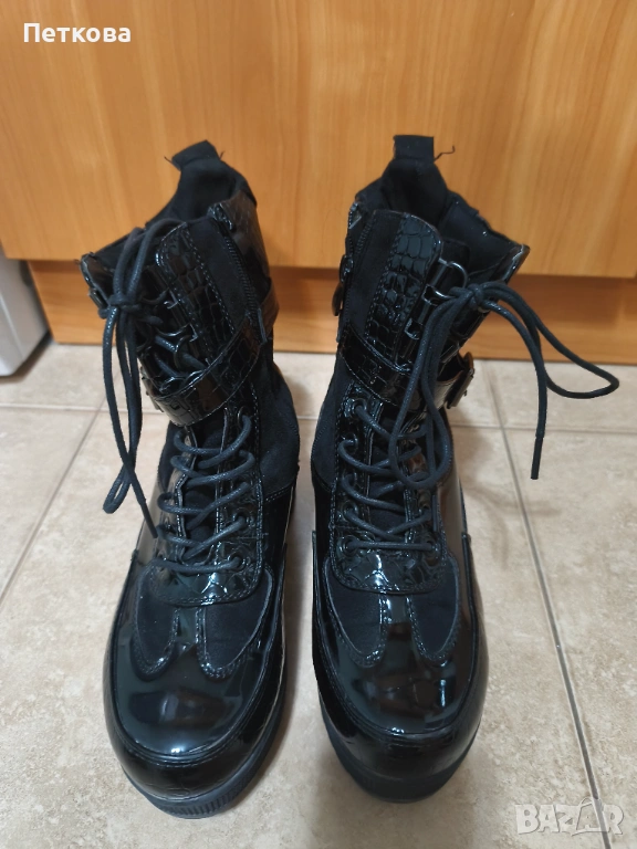 Запазени дамски зимни боти, номер 37. С висока платформа, дебел ток, комбинация от кожа, лак и велур. С грайфер, подходящ за зимата. Закопчават се с цип, имат връзки и украсителен елемент. Удобни и подходящи за различни поводи.