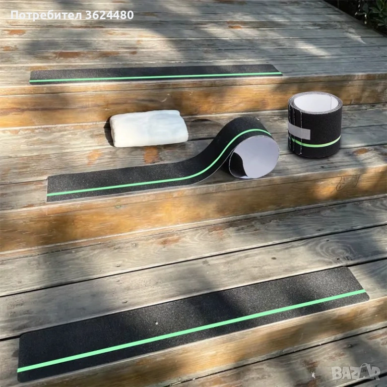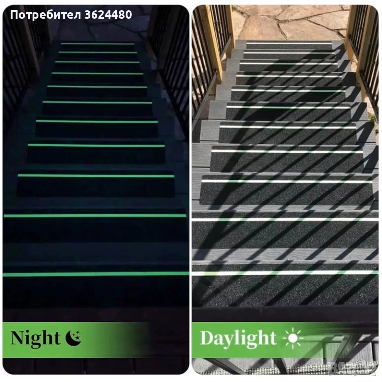 Подобрете безопасността на Вашия дом или офис с нашия комплект от 5 броя светещи противоплъзгащи ленти за стълби. Тези ленти са специално проектирани да предотвратяват инциденти, като осигуряват отлично сцепление благодарение на абразивните частици от алуминиев оксид върху здрава PVC + PET основа. Всяка лента с размер 61 х 15 см разполага с вградена фотолуминисцентна светеща ивица с ширина 1.2 см, която свети в ярко зелено в тъмното, маркирайки ясно края на всяко стъпало. Монтажът е изключително лесен благодарение на самозалепващия гръб, който прилепва здраво към дърво, камък или метал.