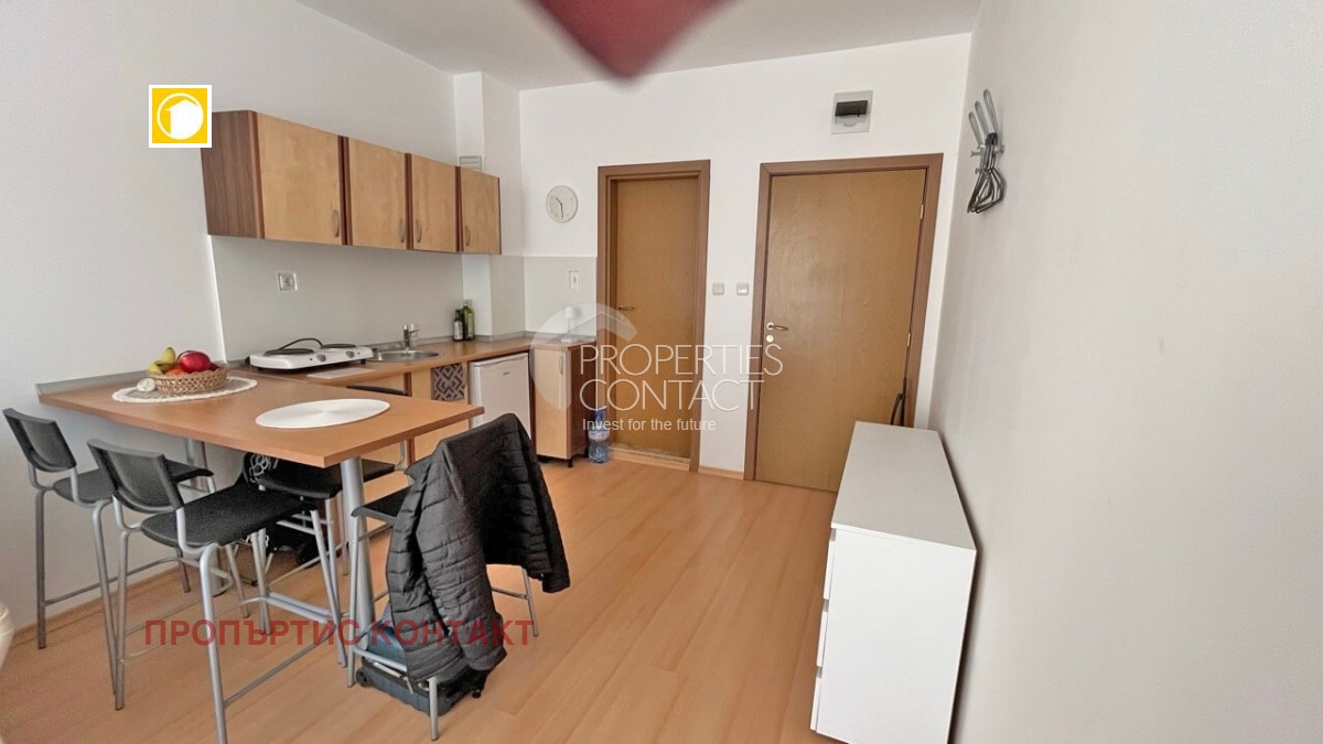 Предлагаме за продажба едностаен апартамент - тип студио в комплекс "Съни Дей 6", разположен на 3 км от Слънчев Бряг. Жилището е на 2 етаж и е с площ от 32 кв.м. с тераса. Апартамент състои се от : секидневна с кухненска зона, оборудвана баня с тоалетна и тераса. Имотът се продава с наличното обзавеждане, климатик и напълно оборудвана баня. Комплекс "Съни Дей 6" е целогодишно работещ и охраняван комплекс, предлагащ множество удобства като фитнес, ресторант, супермаркет, рецепция, 6 външни басейна, 2 мини-голф игрища, тенис корт,спортни площадки, детска площадка и зелени площи за почивка. Разположен е на тихо и спокойно място, на 1,5 км от Аква парка и на 35 км от летище Бургас и 3 км от известния курорт Слънчев бряг,