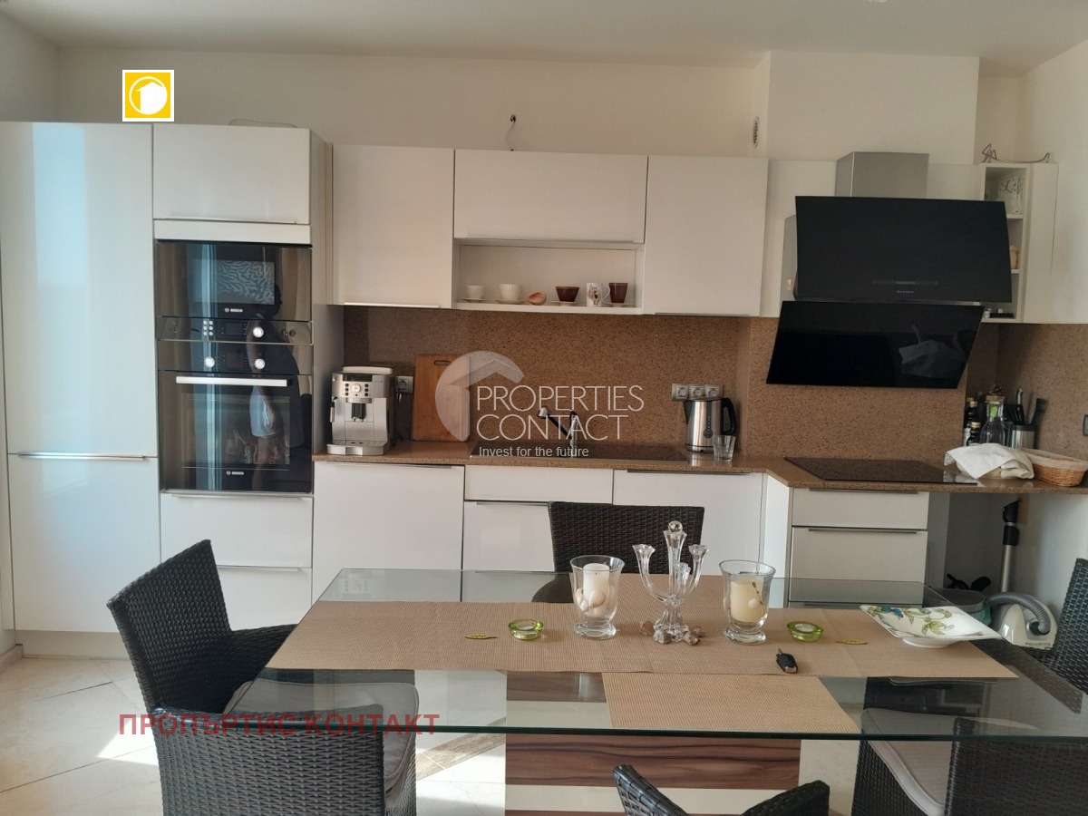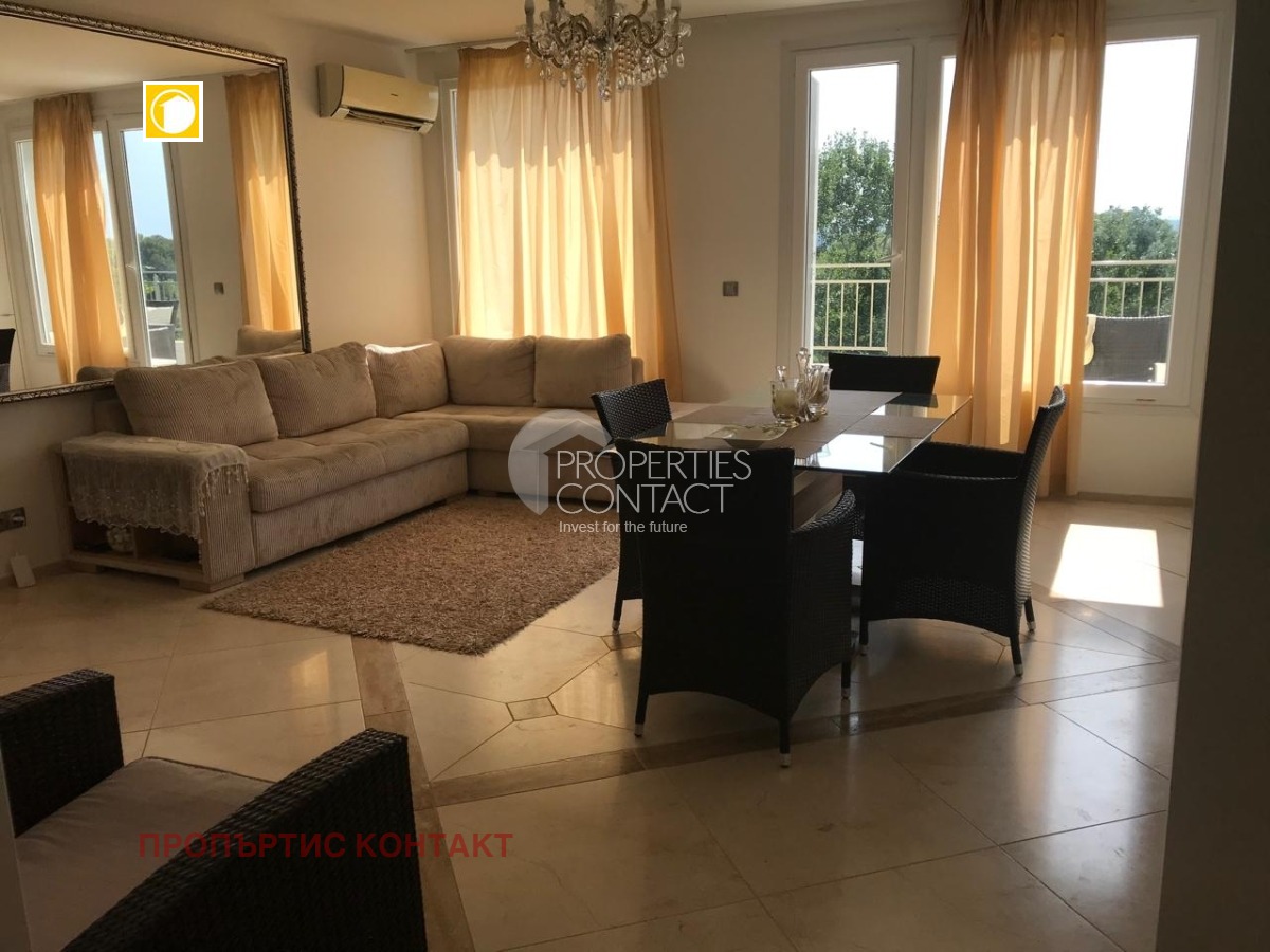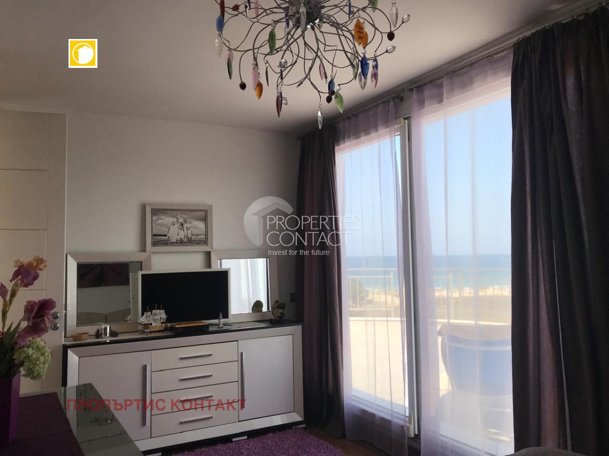 Продаваме луксозен апартамент с панорамна гледка море на първя линия Южен плаж - Приморско, непосредствено до обширната пясъчна ивина на Южния плаж - Приморско. Имотът е с площ по документи 115 кв.м., чиста площ 93 кв.м., разпределени по следния начин: обширно входно антре, кухня с трапезария, две спални, две бани и голяма тераса с прекрасна морска панорама. Помещенията са просторни и светли. Жилището се предлага се луксозно и елегантно обзаведено и оборудвано. Сградата, в която е разположен апартамента е жилищна, разположена на първа линия море и единствено улицата я отделя от прекрасната пясъчна ивица и дюните на плаж ММЦ. Общите части са луксозно изпълнени - облицовани с гранит и парапети от ковано желязо, асансьорът работи целогодишно, а почистването, поддръжката, ремонтите и озеленяването се поддържат от етажна собственост, за което се заплаща такса в размер на около 2000 лв. годишно. Дворът е облагороден и озеленен, има басейн, детска площадка, паркоместа за собствениците вътре в дворното пространство.