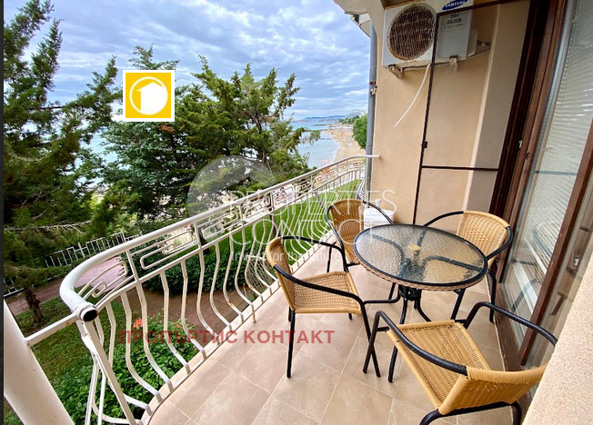 Предлагаме за продажба прекрасен двустаен апартамент в комплекс „Сън Палас“ в Свети Влас, разположен само на 50 метра от плажа. Жилището е с площ от 60 кв.м, намира се на втория етаж. Апартаментът се състои от просторен коридор, светла дневна с кухненски бокс, уютна спалня, баня с тоалетна и тераса, от която се разкрива впечатляваща фронтална гледка към морето. Продава се с много добре запазени мебели и напълно оборудвана техника. Комплекс „Сън Палас“ е разположен непосредствено над плажа, с директен достъп до него. На разположение на собствениците и техните гости са голям открит басейн, целогодишна охрана с контролиран достъп и просторен паркинг с индивидуално паркомясто за всеки апартамент. Локацията на имота е изключително удобна – само на 300 метра от яхтеното пристанище Марина Диневи и на около 500 метра от центъра на Свети Влас. Районът предлага множество магазини, ресторанти и други удобства, което прави този апартамент подходящ както за летни ваканции, така и за целогодишно живеене.