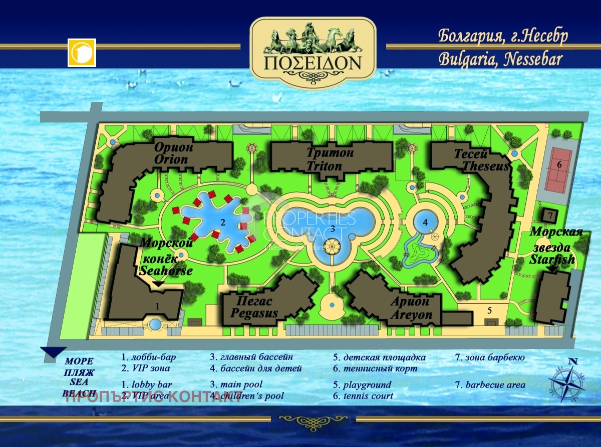 Предлагаме за продажба луксозен тристаен апартамент в престижния комплекс Посейдон (Poseidon), разположен в град Несебър, само 350 м от плажа. Имотът се намира в един от най-елитните жилищни комплекси на българското Черноморие, подходящ както за постоянно обитаване, така и за инвестиция с отлична възвръщаемост. Комплекс Посейдон – Несебър е символ на лукс, стил и комфорт. Състои се от 7 изискани сгради – Орион, Тритон, Тесей, Пегас, Арион, Морска звезда и Морско конче, разположени сред богато озеленена територия с уникален ландшафтен дизайн. Комплексът е на 400 м от аквапарк Aqua Paradise и в непосредствена близост до магазини, ресторанти, кафенета и търговски обекти. Характеристики на имота: Тристаен апартамент с обща площ 106,18 кв.м, разположен на втори жилищен етаж, в сграда „Пегас“. Разпределението включва: входно антре просторна дневна с кухненски бокс и трапезария две спални две бани с тоалетна две тераси с гледка към басейна Апартаментът се предлага „на тапа“, с възможност за завършване „под ключ“ според предпочитанията на купувача. Отличен избор за ваканционен имот, целогодишно живеене или доходоносен имот под наем през летния сезон. Удобства и инфраструктура в комплекс Посейдон: два външни басейна – за възрастни и деца; детски басейн с пързалка, изкуствена река и езеро; ВИП зона – лагуна с шатри за релакс; лоби бар; барбекю зона с капацитет до 20 човека; детска площадка; лекарски и зъболекарски кабинет; открит тенис корт; боулинг и руски билярд; безплатен безжичен интернет (Wi-Fi); охраняем паркинг и възможност за подземен гараж срещу заплащане.