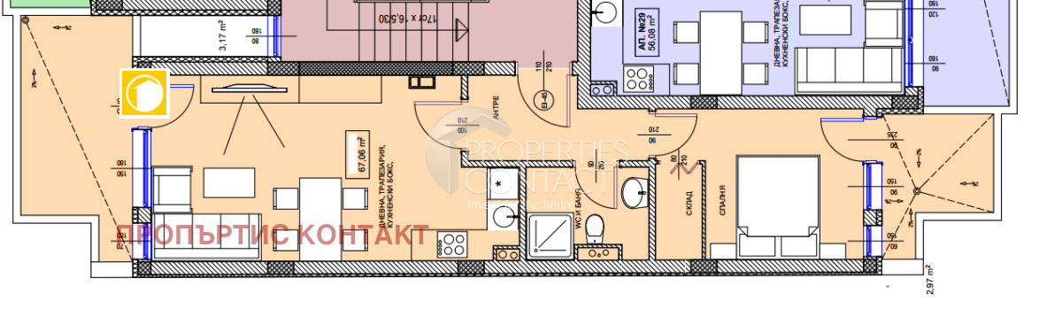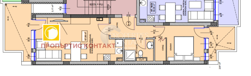 Предлагаме за продажба един от двустайните апартаменти в модерна шестетажна жилищна сграда в строеж в град Поморие, която ще разполага с два входа – А и Б. Жилището се намира на шести етаж и е с обща площ от 79,43 кв.м, от които 67,06 кв.м – чиста площ и 12,37 кв.м – идеални части. Апартаментът се отличава с много добро и функционално разпределение, с две изложение. Състои се от входно антре, просторна дневна с кухненски кът и тераса, баня с тоалетна, както и спалня с тераса от противоположната страна. Предлага се завършен „до ключ“: с подови настилки от ламинат и гранитогрес, стени – шпакловка и боя, монтирани осветителни тела, ключове и контакти. Баните ще бъдат напълно оборудвани с бойлер, мивка, душ и тоалетна с вграден моноблок. Началото на строителството- март 2025 г.,завършването – юни 2027 г. В сградата се предлагат и други типове имоти – студия с или без складови помещения на цени от 76300 евро, двустайни апартаменти от 88300 евро, както и тристайни апартаменти от 123400 евро. Налични са също и паркоместа на цена от 15 000 евро. Местоположението на сградата осигурява отличен баланс между спокойствие, природа и бърз достъп до всички удобства. Разстоянието до плажа е около 500 метра, а в непосредствена близост се намират магазини, аптеки, градски транспорт и други необходими услуги. Летище Бургас е на 15 минути с автомобил. Предлагат се гъвкави схеми за разсрочено плащане, съобразени с нуждите и възможностите на купувача. Годишната такса поддръжка е 150 евро без ДДС. За повече информация и персонализирана оферта, моля свържете се с наш консултант.