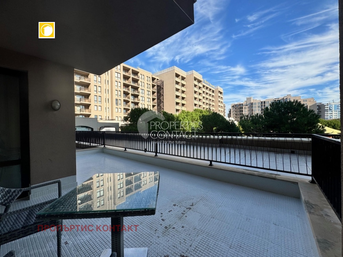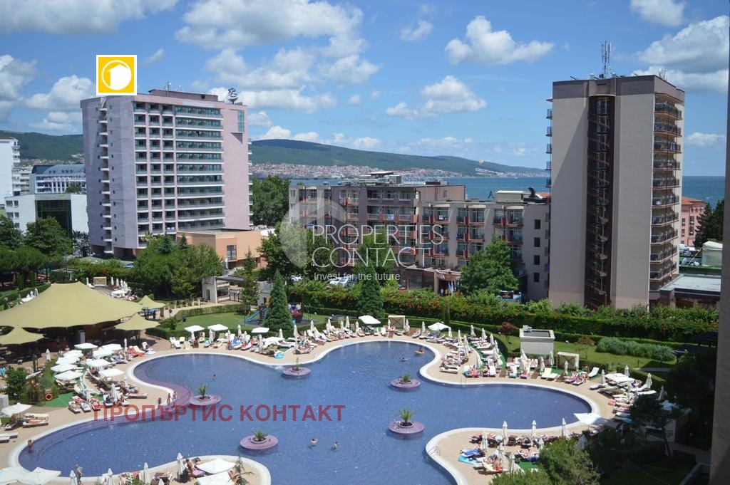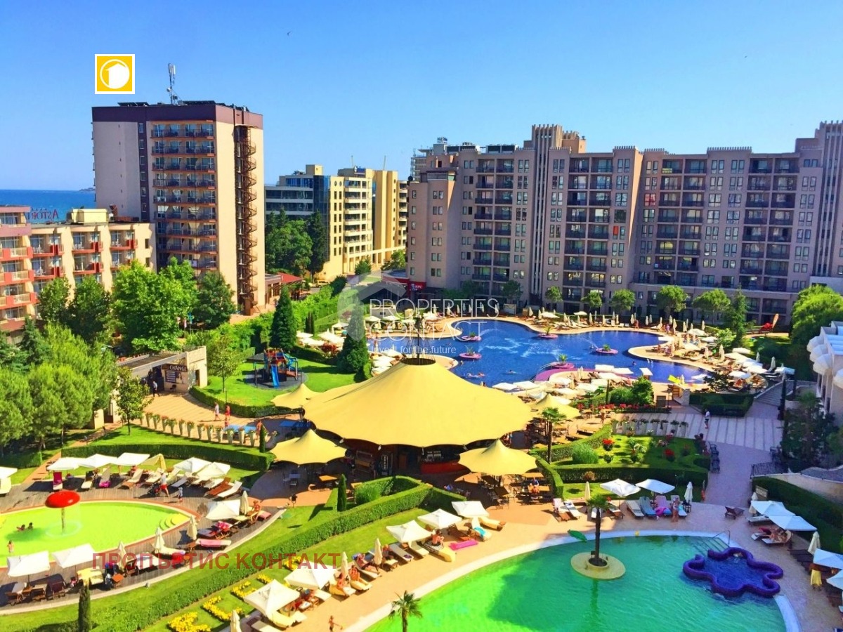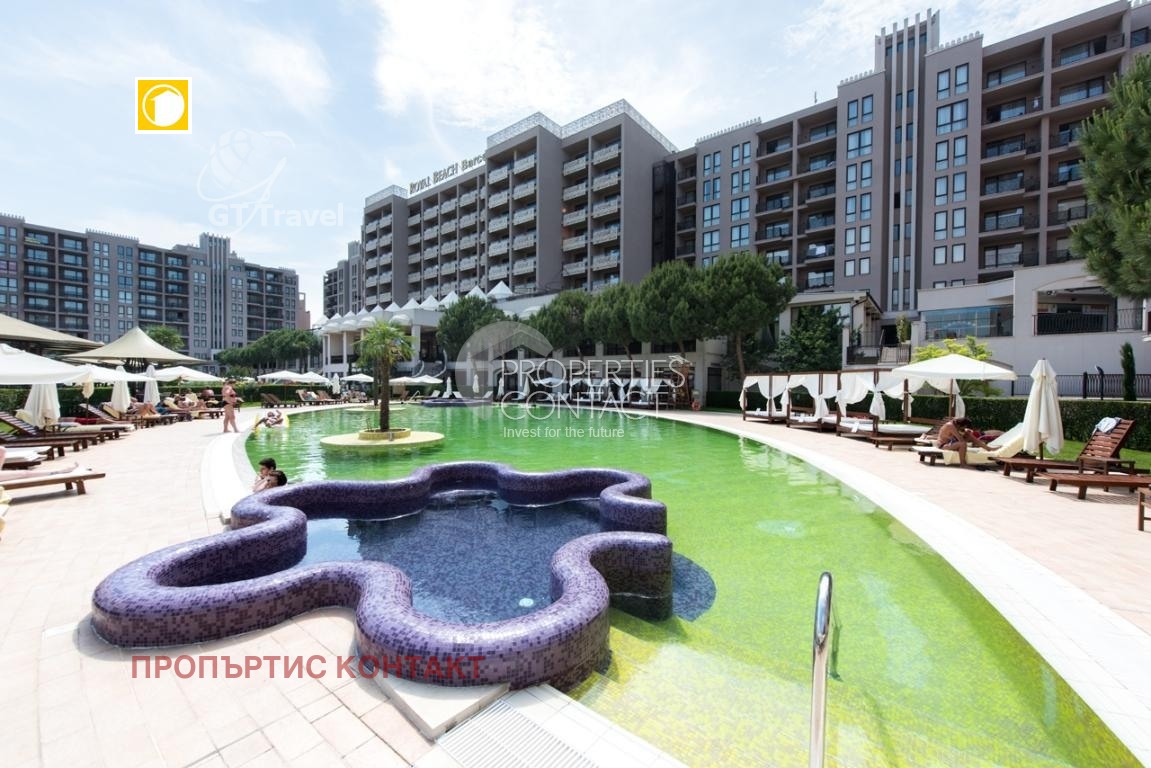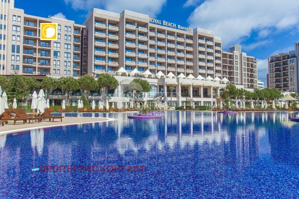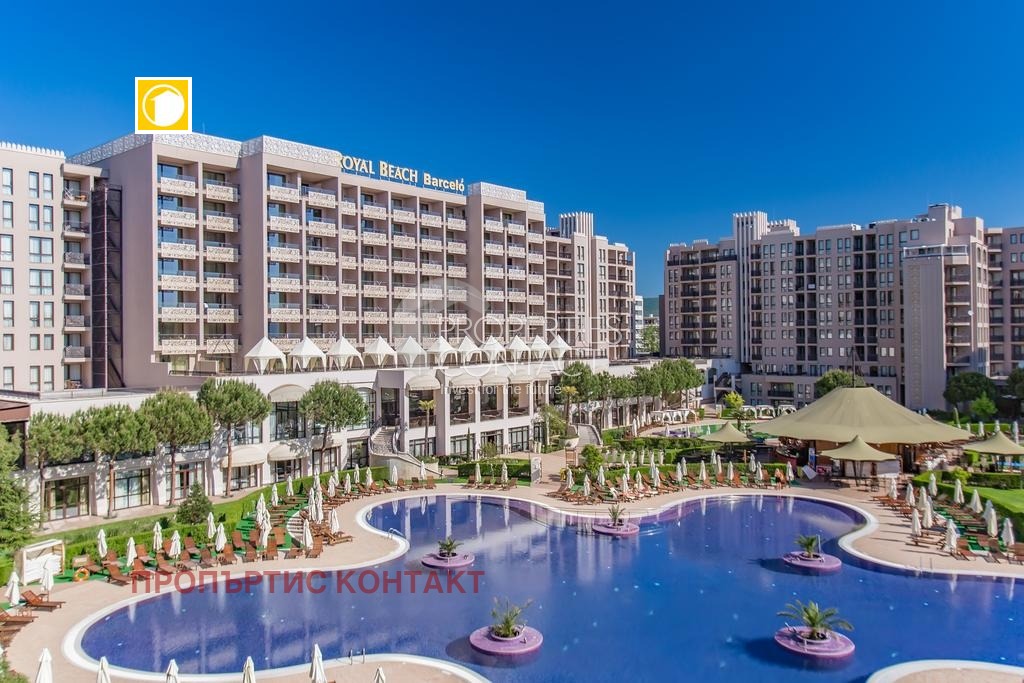 Продава се стилно обзаведен двустаен апартамент с площ от 78 кв.м, разположен на 2 етаж в престижния комплекс Royal Beach Barcelo, в сърцето на Слънчев бряг. Само на 150 метра от морето и златистия плаж, в близост до търговски центрове, ресторанти и всички удобства на централната част на курорта. Жилището се състои от светла дневна с кухненски бокс, самостоятелна спалня, баня с тоалетна и тераса с гледка към комплекса. Продава се напълно обзаведен и оборудван, готов за лично ползване или отдаване под наем. Имотът е подходящ както за целогодишно живеене, така и за ваканционен апартамент на морето в България. Комплексът предлага: открити и закрити басейни, СПА център, фитнес, ресторанти, барове, подземен паркинг и перфектно поддържани зелени площи. Инвестиционен потенциал: доходност от 50–100 евро на нощ в активния сезон, благодарение на отличната локация и високото търсене в района.