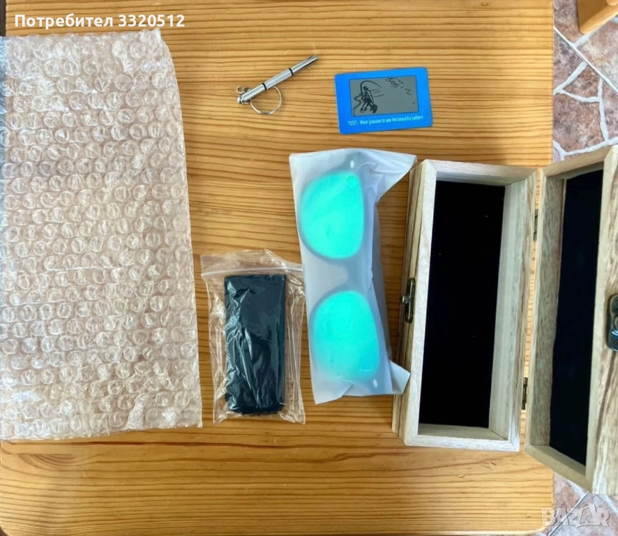 Очилата са нови, със синьо-зелени стъкла. Аксесоарите, които се подаряват са: кутия, мини отвертка и почистваща кърпичка.