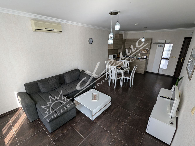 Двустаен апартамент с гледка море, разположен във ваканционен комплекс, находящ се на първа линия в гр. Свети Влас. Комплексът се намира само на 250 метра от яхтеното пристанище. Жилището е с площ от 61 кв. м. и е разположено на трети етаж. Състои се от всекидневна с кухненски кът, спалня, баня с тоалетна и тераса. Апартаментът се продава с обзавеждането. Около комплекса има добре изградена инфраструктура. Наблизо има: голям супермаркет, магазини, аптека, ресторанти, заведения за бързи хранения, плаж, увеселителен парк и други развлечения.