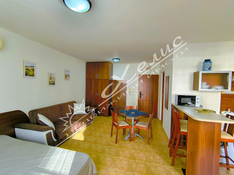Просторно обзаведено студио, разположено в един от най-добре поддържаните затворени комплекси в гр. Свети Влас - комплекс Морски Фар, на 200 м от морето. Жилището е с площ от 48 кв. м. и е разположено на втори етаж. Състои се от просторна стая с кухненски кът, баня с тоалетна и тераса. Апартаментът се продава с обзавеждането. Такса поддръжка - 9Е/кв.м.