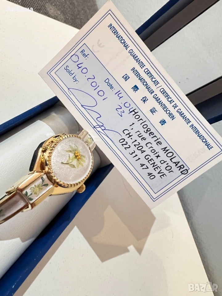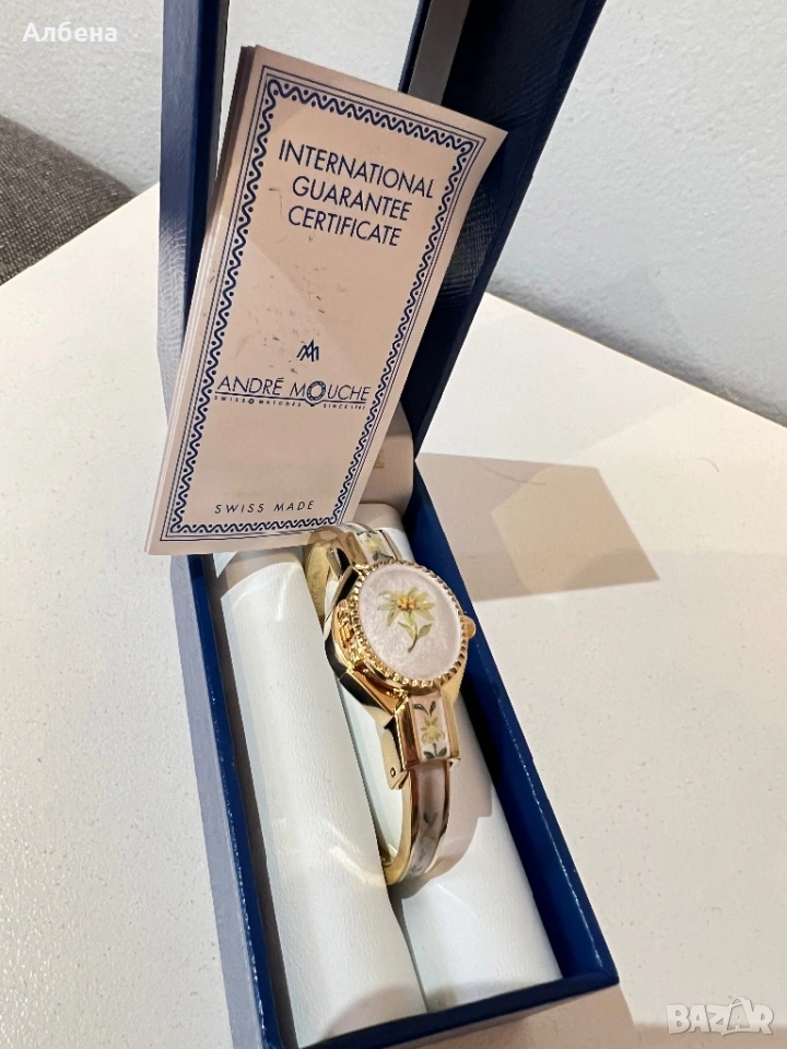 Златен часовник на марката Andre Mouche. Закупувам е от Швейцария. Към него има попълнен сертификат.