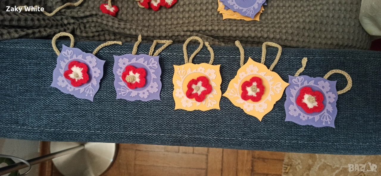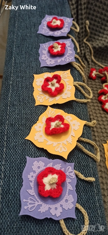 Красиви ръчно плетени мартеници, всяка поставена върху картонче с венец от цветя, готови за подарък за близките ви. Мартениците могат да се вържат около ръката като гривна, на чанта или някъде другаде. Могат да се използват и като книгоразделител. 24броя, цената е за всички.