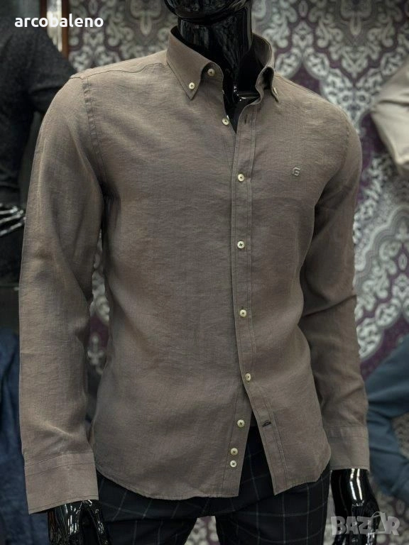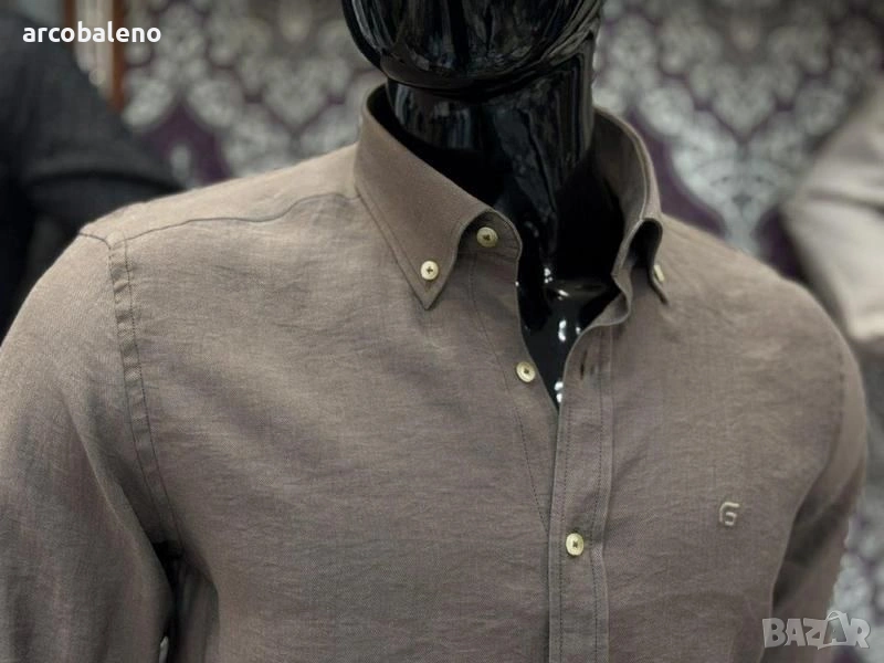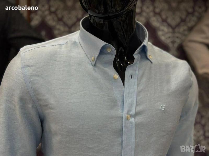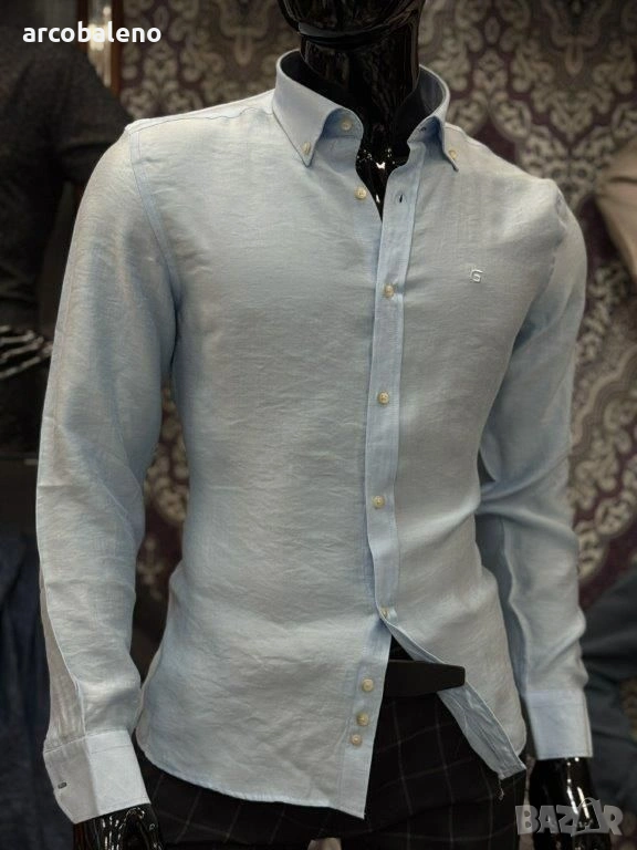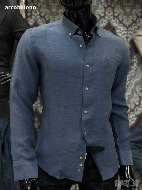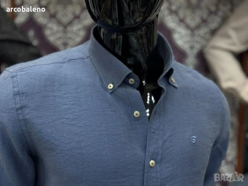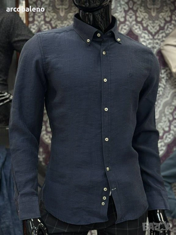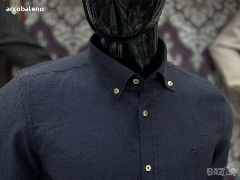 Ежедневна мъжка риза (casual fit) с дълъг ръкав и текстурирана повърхност изработена от смес от лен и памук, които осигуряват дишане и комфорт, класическа яка с копчета (button-down collar) и малко, дискретно лого на левия джоб на гърдите.