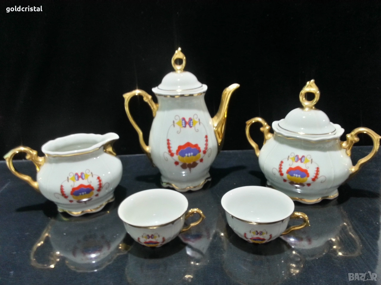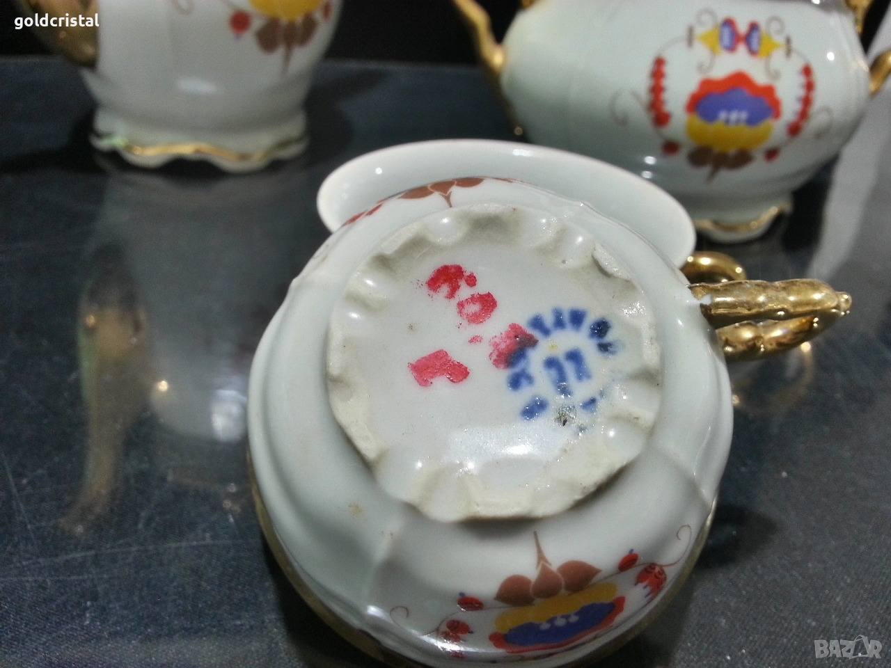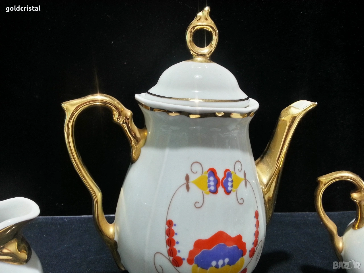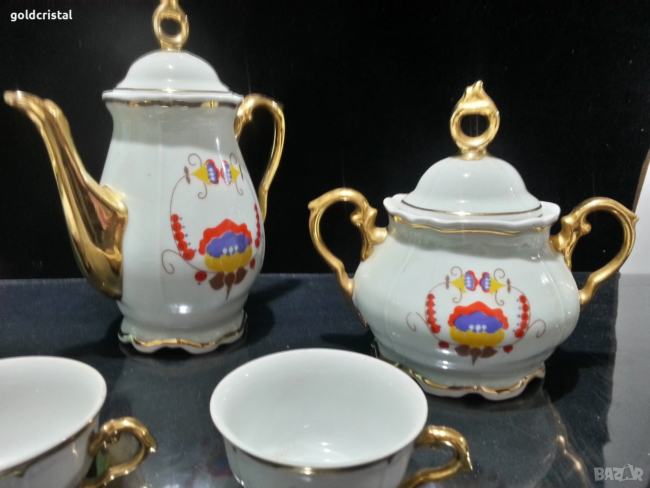 Стар български порцелан барок чайник заханица латиера и две чашки за кафе без забележки сервиз комплект сет лот ретро арт декор винтидж колекция стари старинни антикварни предмети обзавеждане за дома и семейството подходящи за подарък за ценители и колекционери