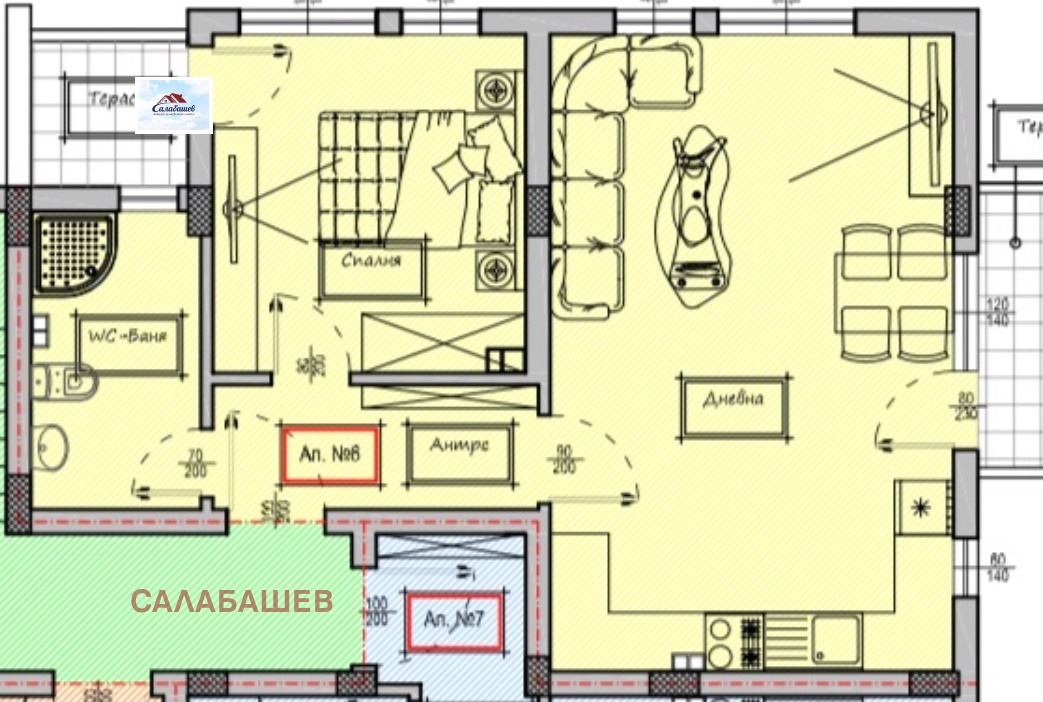 Агенция Салабашев предлага двустаен апартамент ново строителство в град Пазарджик, квартал Стадиона, в близост до парк Стадиона. Жилището е с площ от 72.84 кв.м. с общите части и се състои от всекидневна с кухня, спалня, обща тераса, входно антре и баня с тоалетна. Апартаментът се издава на степен на завършеност: стени и тавани гипсова мазилка; под циментова замазка; стени в санитарни помещения вароциментова мазилка; под тераси мразоустойчив гранитогрес; ВиК на тапа; ЕЛ инсталации осветление, оптична връзка за цифрова телевизия и интернет, домофона инсталация, мълниезащита и заземителна инсталация, заготовка за климатици; дограма 5-камерна PVC дограма с високи изолационни показатели за ниски енергийни разходи клас А, стъклопакет двоен с общ габарит 28 мм 6 мм четири сезона + бяло 4 мм с аргонов газ поставен в стъклопакета и входна блиндирана врата. Жилището се намира на втори етаж в четириетажна тухлена кооперация с луксозен асансьор.