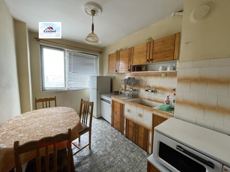 Салабашев имоти продава тристаен апартамент в района на Окръжна болница, в близост до парк - остров Свобода. Жилището е с площ от 80 кв.м. и се състои от преходен хол, кухня, спалня, детска стая, една голяма тераса, мокро помещение и баня с тоалетна. Апартаментът се намира на осми етаж в дванадесететажен тухлен блок с асансьор. Изложението е южно. Към имота има избено помещение.