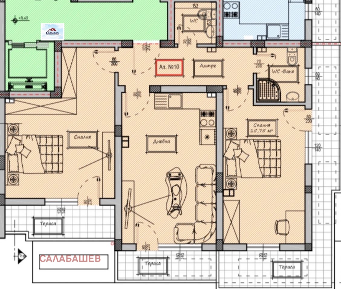Агенция Салабашев предлага тристаен апартамент ново строителство в град Пазарджик, квартал Стадиона, в близост до парк Стадиона. Жилището е с площ от 120.84 кв.м. с общите части и се състои от всекидневна с кухня и тераса, две спални с големи тераси, входно антре, баня с тоалетна и отделна тоалетна. Апартаментът се издава на степен на завършеност: стени и тавани гипсова мазилка; под циментова замазка; стени в санитарни помещения вароциментова мазилка; под тераси мразоустойчив гранитогрес; ВиК на тапа; ЕЛ инсталации осветление, оптична връзка за цифрова телевизия и интернет, домофона инсталация, мълниезащита и заземителна инсталация, заготовка за климатици; дограма 5-камерна PVC дограма с високи изолационни показатели за ниски енергийни разходи клас А, стъклопакет двоен с общ габарит 28 мм 6 мм четири сезона + бяло 4 мм с аргонов газ поставен в стъклопакета и входна блиндирана врата. Жилището се намира на трети етаж в четириетажна тухлена кооперация с луксозен асансьор.