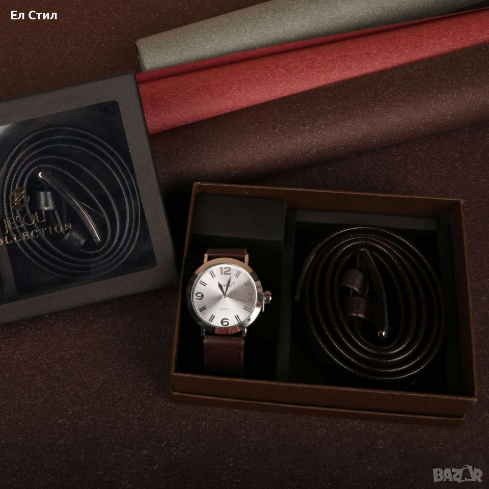 Подаръчен комплект Колан в черен цвят заедно с часовник кафяв/черен