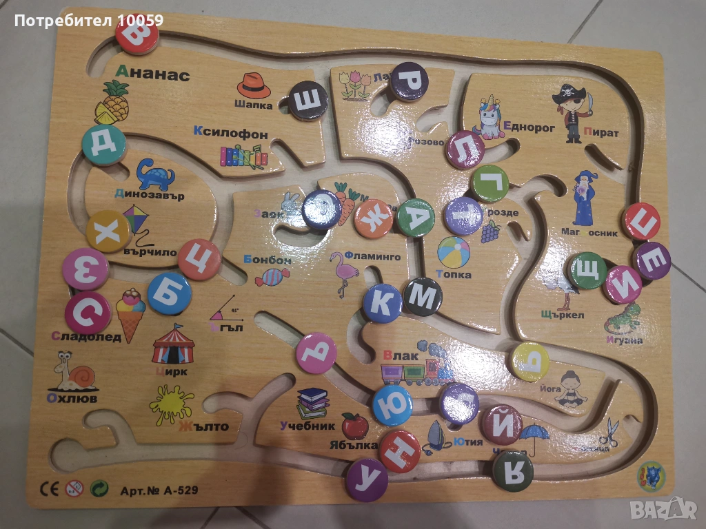 Снимка 7. Дървен пъзел тип лабиринт с подвижни букви от българската азбука. Цена 7 евро