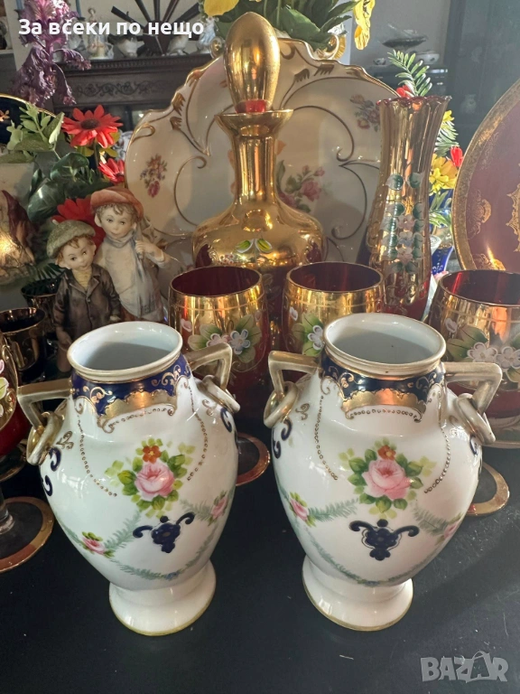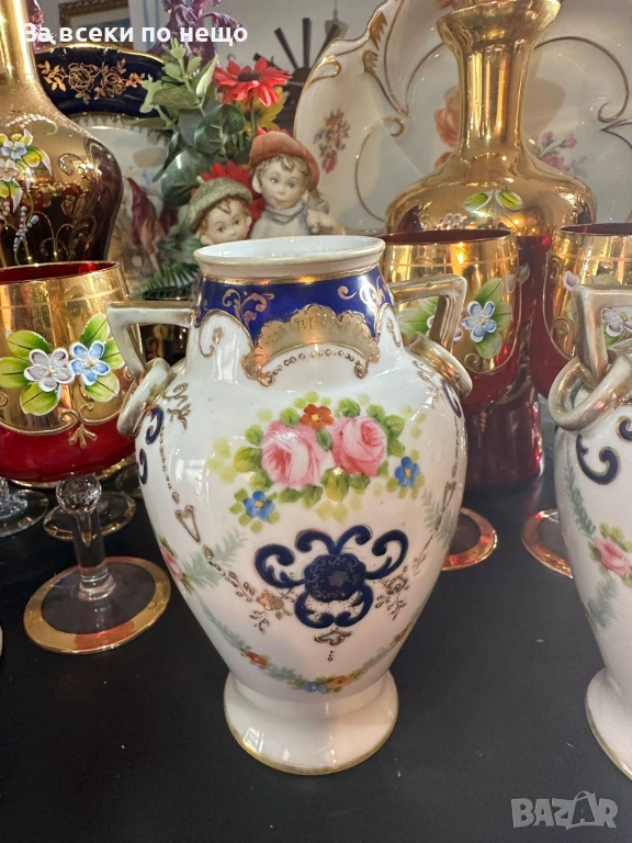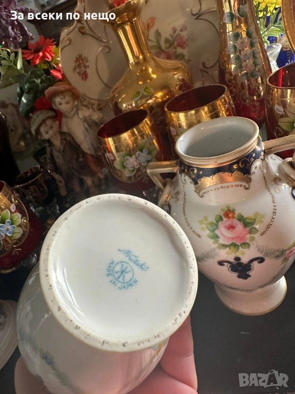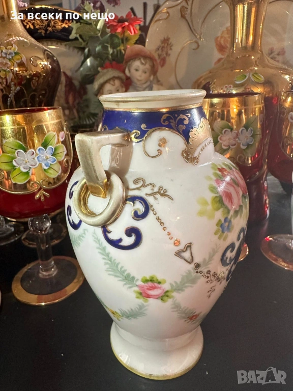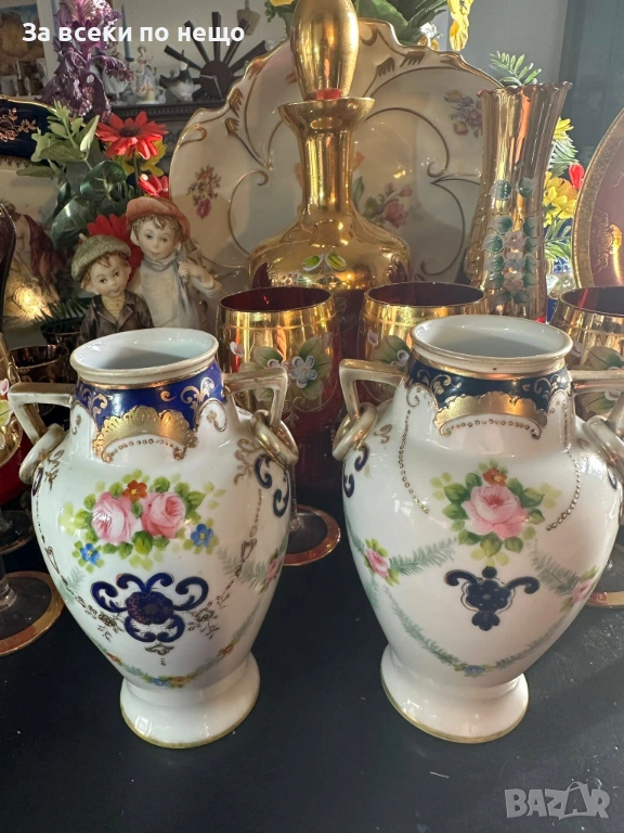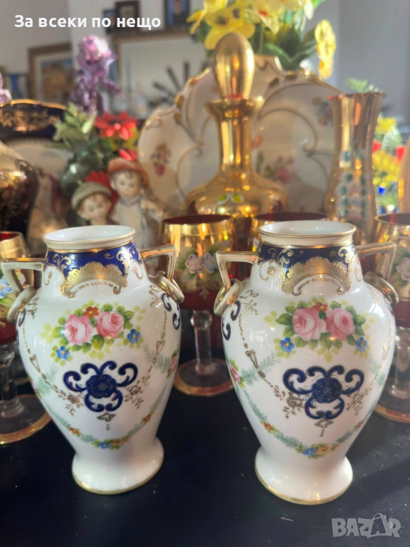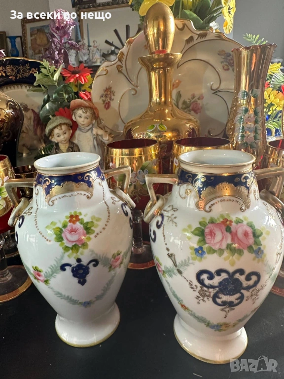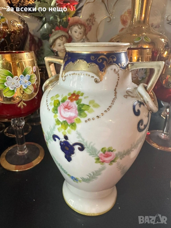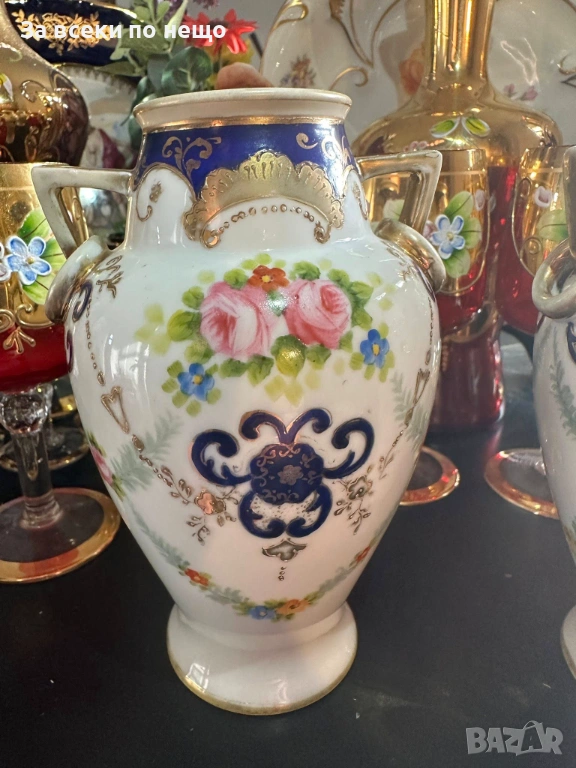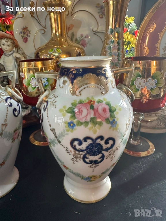 Noritake Japan Circa 1908 - невероятно красиви две японски вази с две ръкохватки и изящно ръчно нарисувани цветя и букети, дебела и великолепна златна декорация в източен стил, размери- високи 15 см, двете вазите са с отлично качество и състояние, една истинска ефектна находка, подходяща за всяка колекция или интериорна украса.