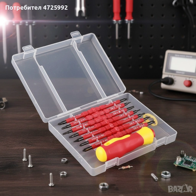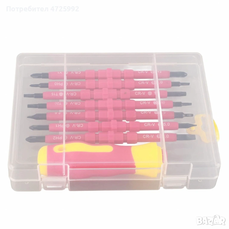 Комплект: 8 части (1 изолирана дръжка + 7 двустранни бита = 14 накрайника);