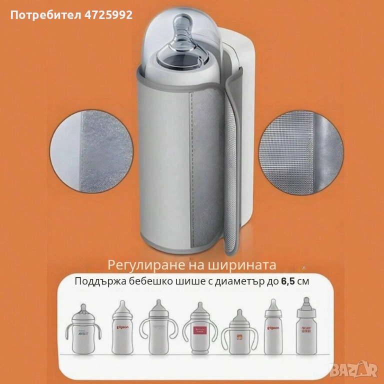 Свързване / съвместимост: USB зареждане; подходящ за бебешки шишета с диаметър до 6.5 см;