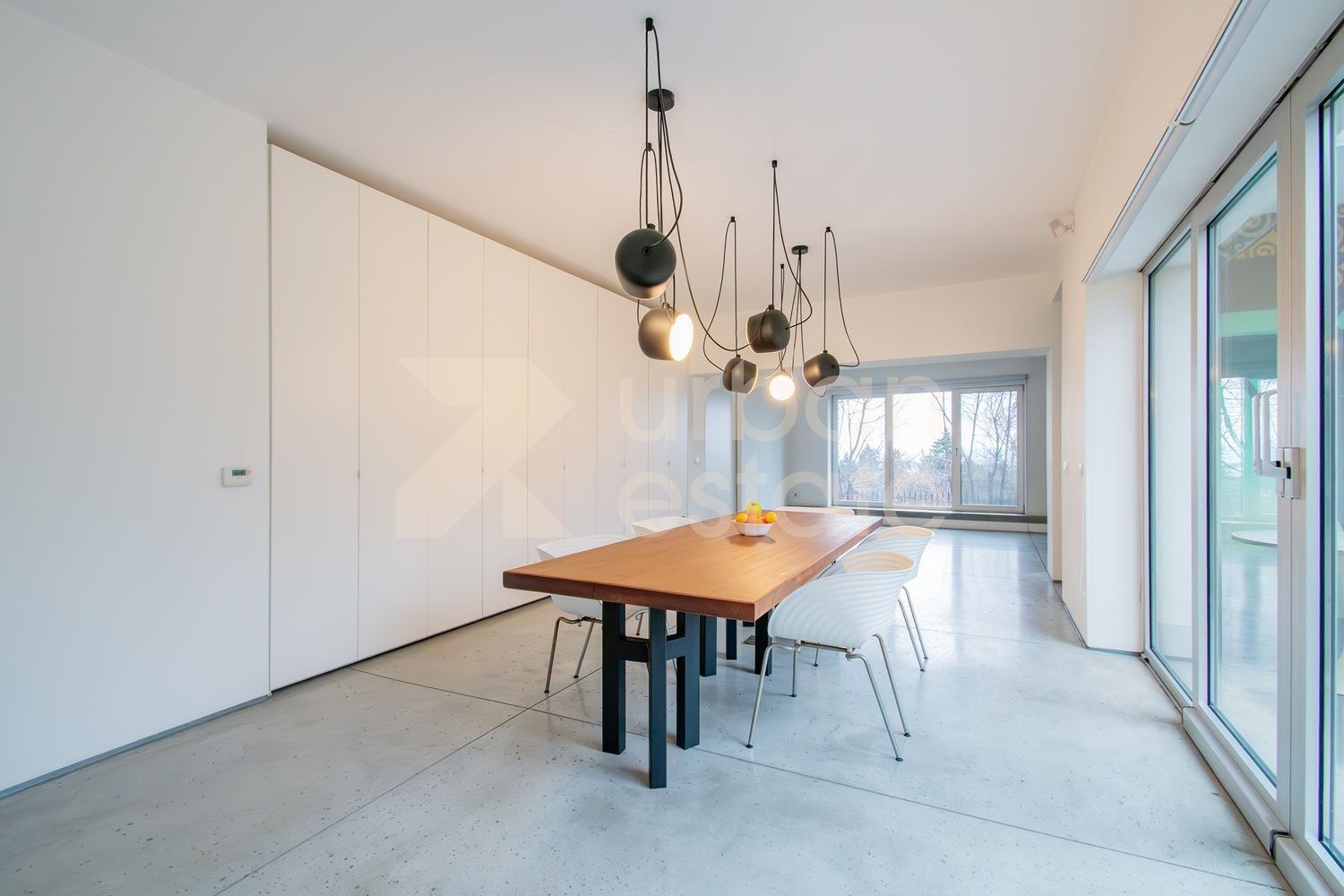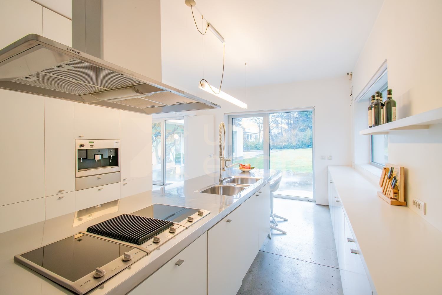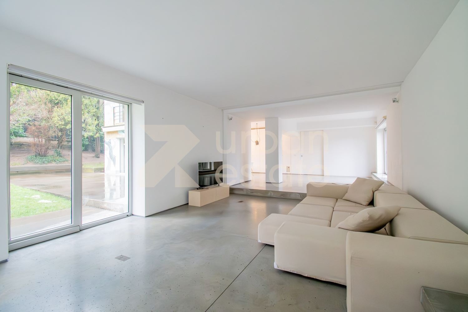 Интериорът е решен с изключително усещане за мащаб, светлина и архитектурна чистота. Пространствата са отворени, логично свързани и подчертани от широки френски прозорци и плавни преходи между дневните зони.